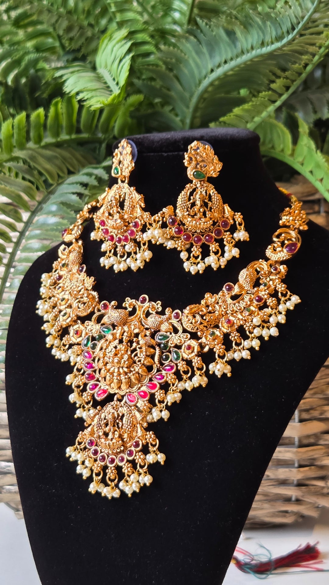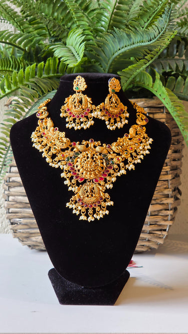 This elegant Brass Imitation Temple Jewellery Set features a beautifully crafted short choker-style necklace and matching earrings, both adorned with intricate temple-inspired carvings. The rich brass finish and delicate detailing capture the timeless beauty of traditional temple jewellery. Perfect for weddings, festivals, or cultural occasions, this set adds a divine touch to any ensemble, blending heritage with sophistication.