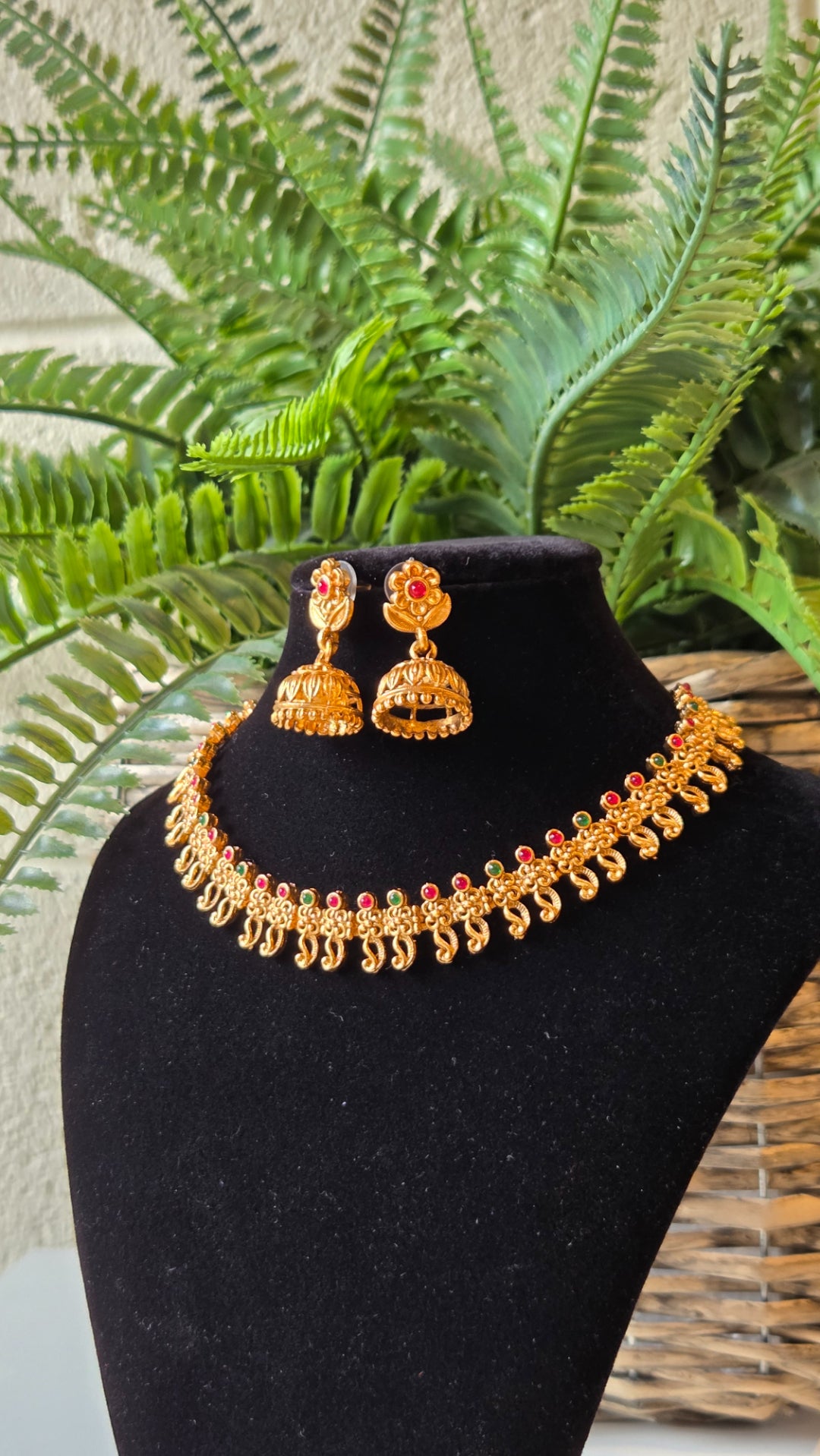 This elegant Brass Imitation Temple Jewellery Set features a beautifully crafted short choker-style necklace and matching earrings, both adorned with intricate temple-inspired carvings. The rich brass finish and delicate detailing capture the timeless beauty of traditional temple jewellery. Perfect for weddings, festivals, or cultural occasions, this set adds a divine touch to any ensemble, blending heritage with sophistication.