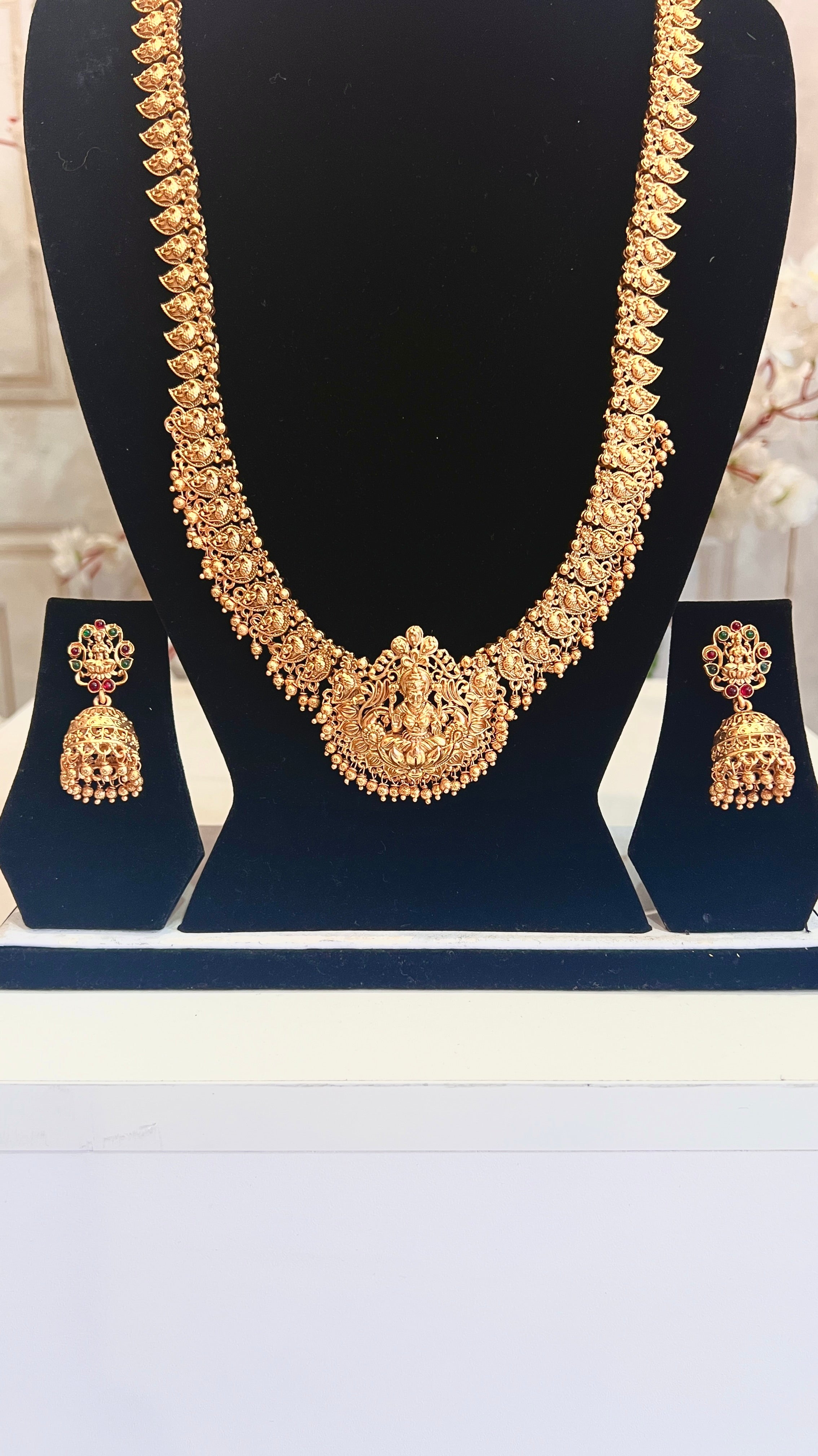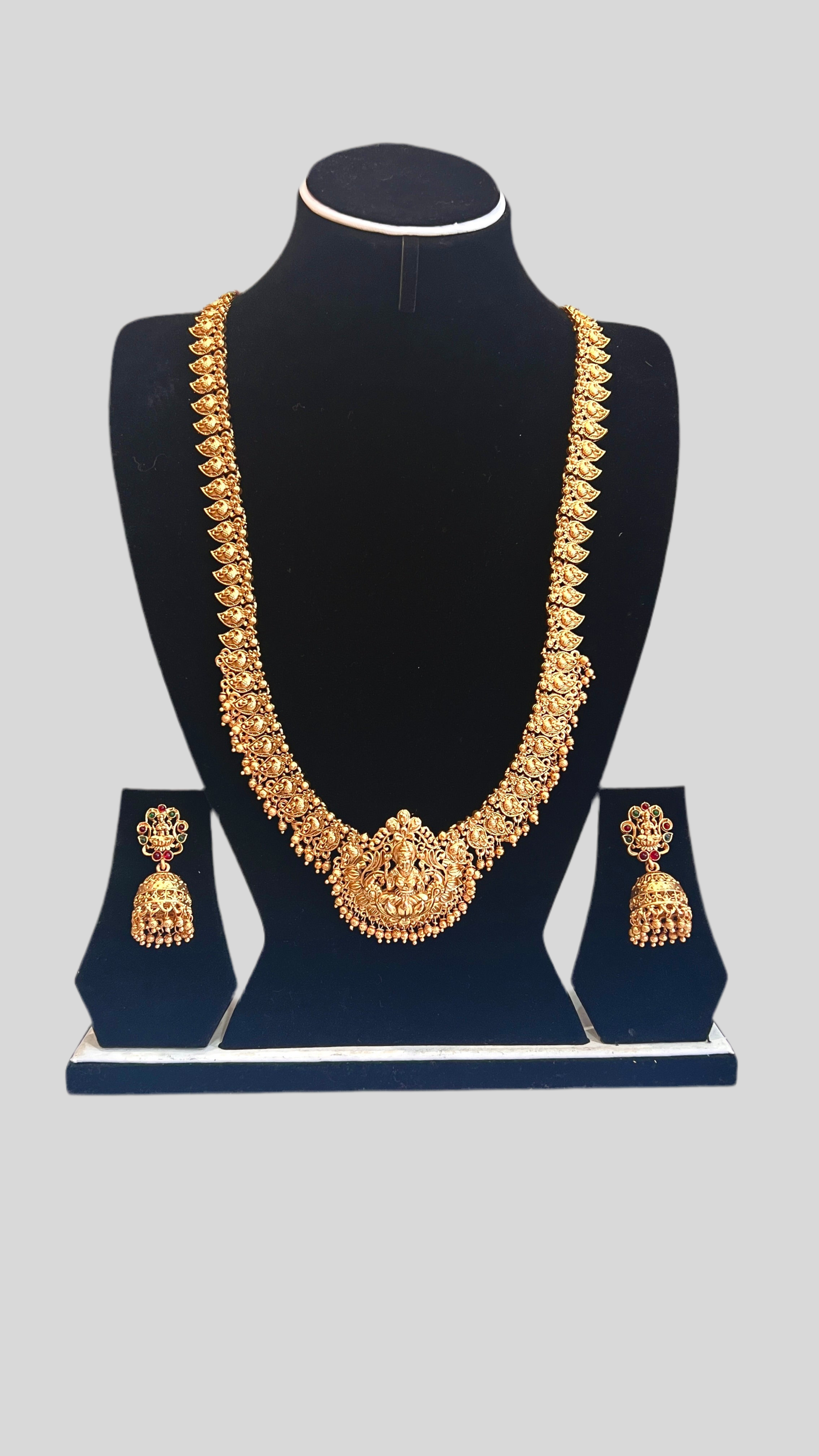 Brass Temple Pearl Long Necklace with Earrings Meenakshi