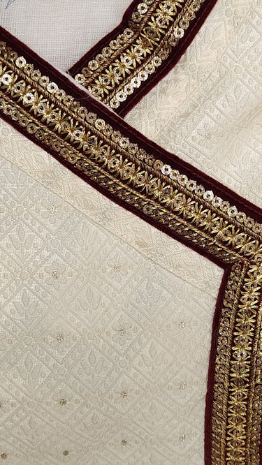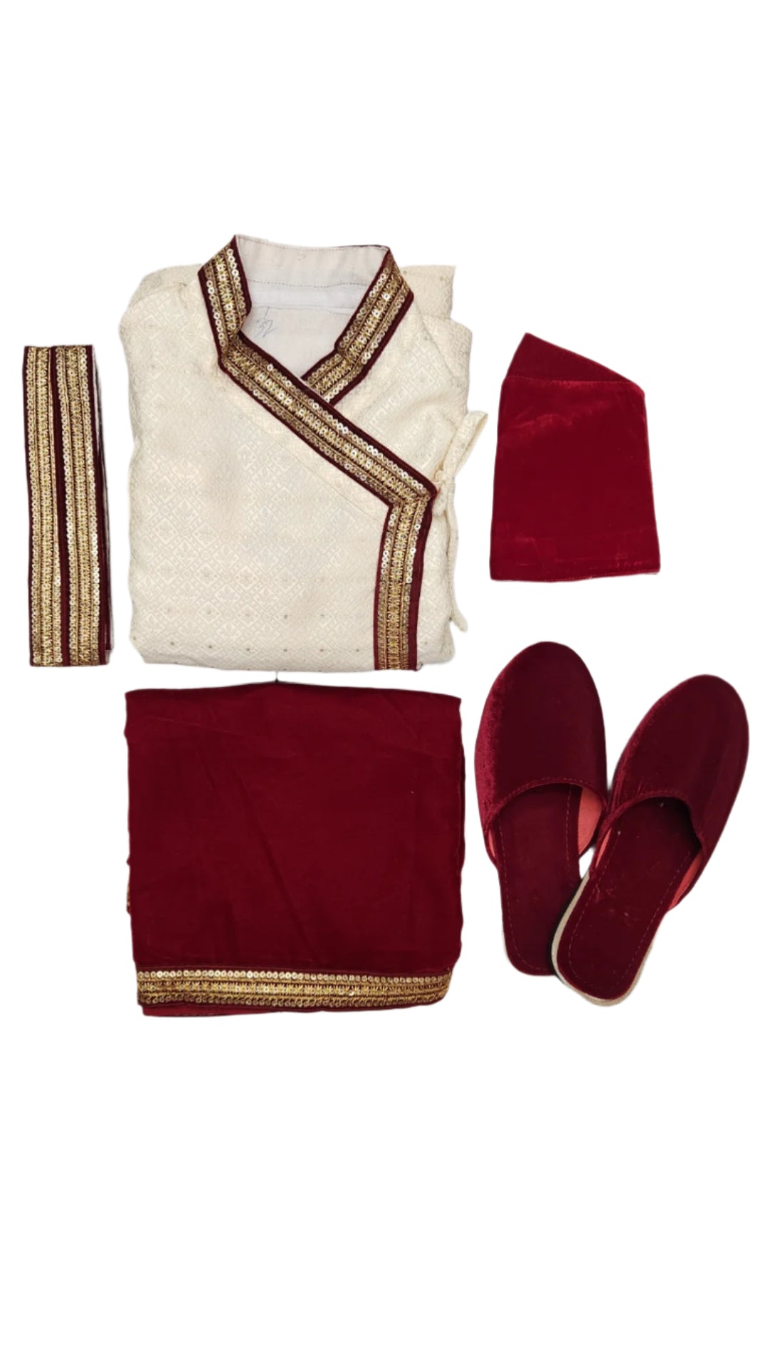 Allow your exceptional second to be the most valuable moment of your life by wearing this set of Daura Surwal. This Daura Set embroidery details on ivory silk come with a makhmal dupatta, Suruwal, Shoes, Belt, and the topi.