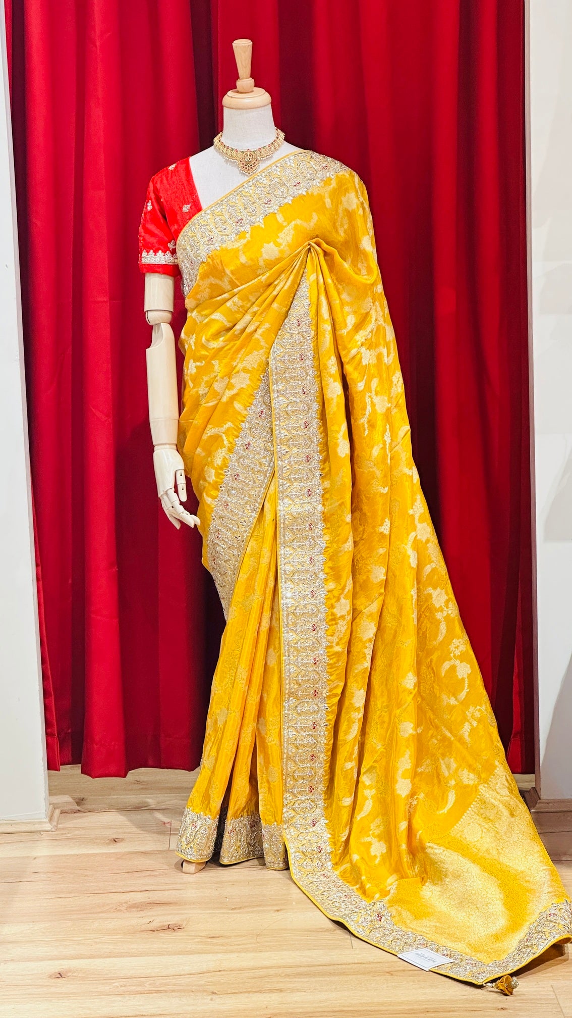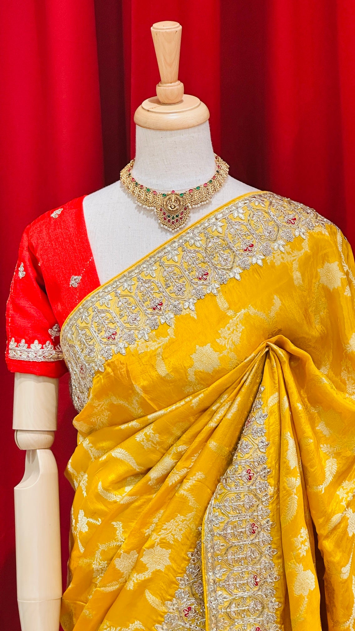 Elevate your wardrobe with this luxurious Crepe Silk Banarasi Saree, crafted to perfection with intricate floral weaves and stunning Swarovski embellishments. The saree features traditional Banarasi craftsmanship with a rich, textured crepe silk fabric that drapes beautifully and offers a graceful flow. Its border is adorned with exquisite hand-embroidered zari work in gold and silver threads, creating an opulent finish. Swarovski crystals delicately enhance the design, adding a touch of sparkle to this timeless piece. Ideal for weddings, festivals, and special occasions, this saree is the perfect blend of classic elegance and contemporary luxury.