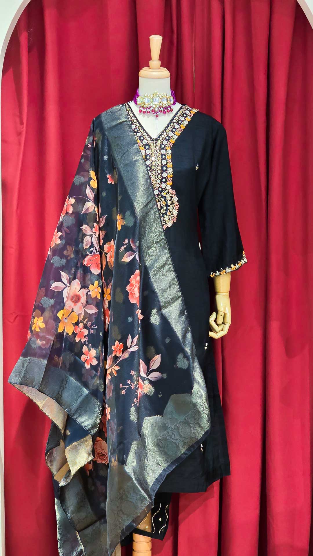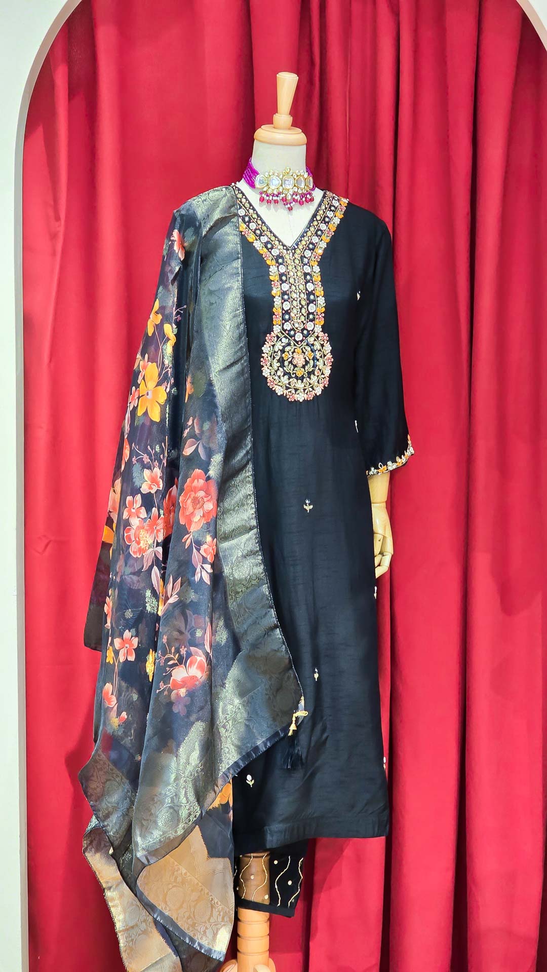 Discover effortless elegance with this exquisite silk kurta set. The kurta features a beautifully detailed hand-embroidered neckline, adding a touch of artisanal charm to the classic design. Made from soft, breathable cotton, it ensures comfort and style for any occasion. Paired with versatile, easy-to-wear pants with an elastic waistband, this set offers a flattering fit and unmatched ease. Complete the look with the coordinating floral shawl, which adds a burst of vibrant color and delicate patterns, perfect for draping over your shoulders or tying as a stylish accent. Whether for a casual day out or a festive gathering, this ensemble combines traditional craftsmanship with contemporary comfort.