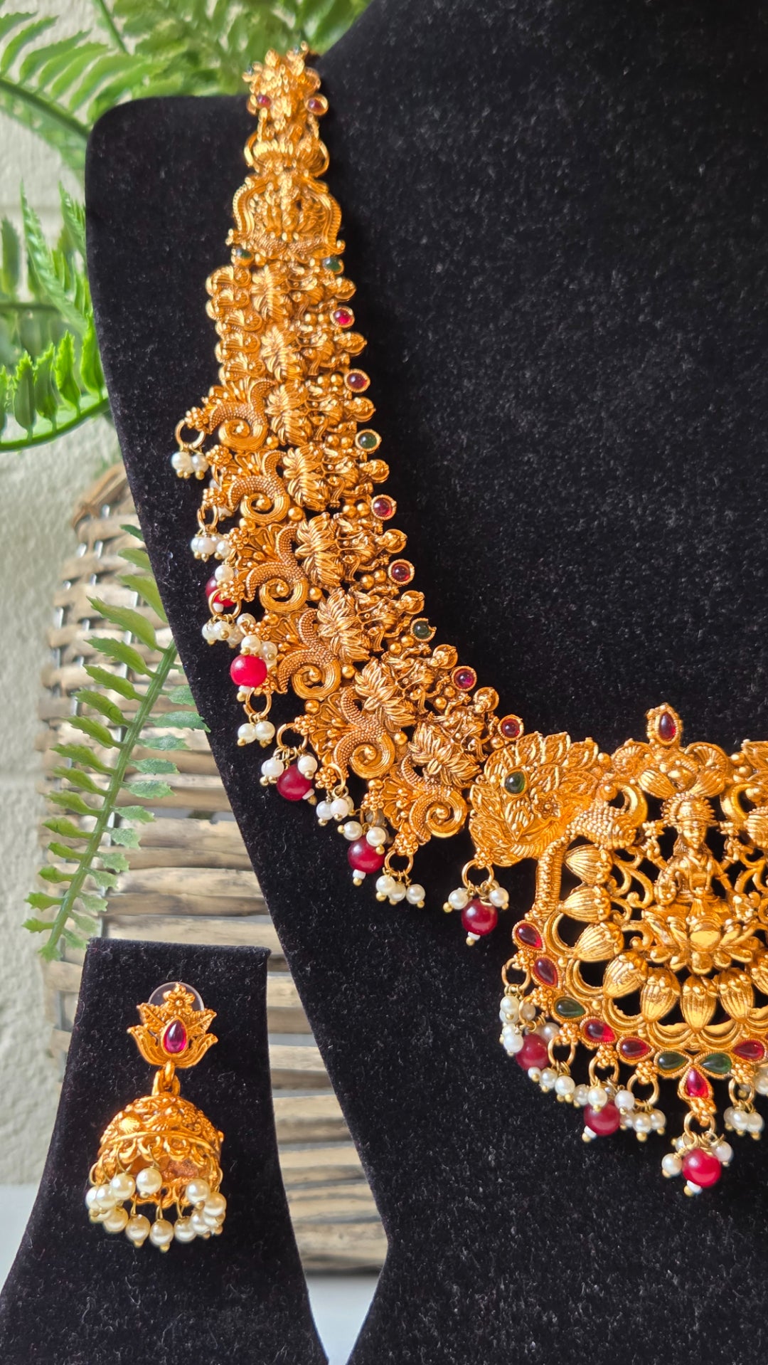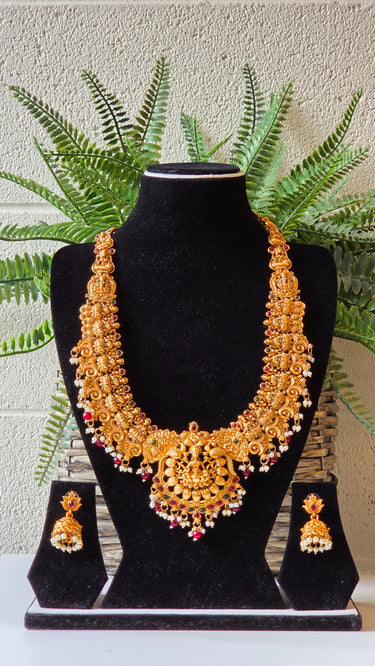 Brass Temple Pearl Long Necklace with Earrings Aaradhya