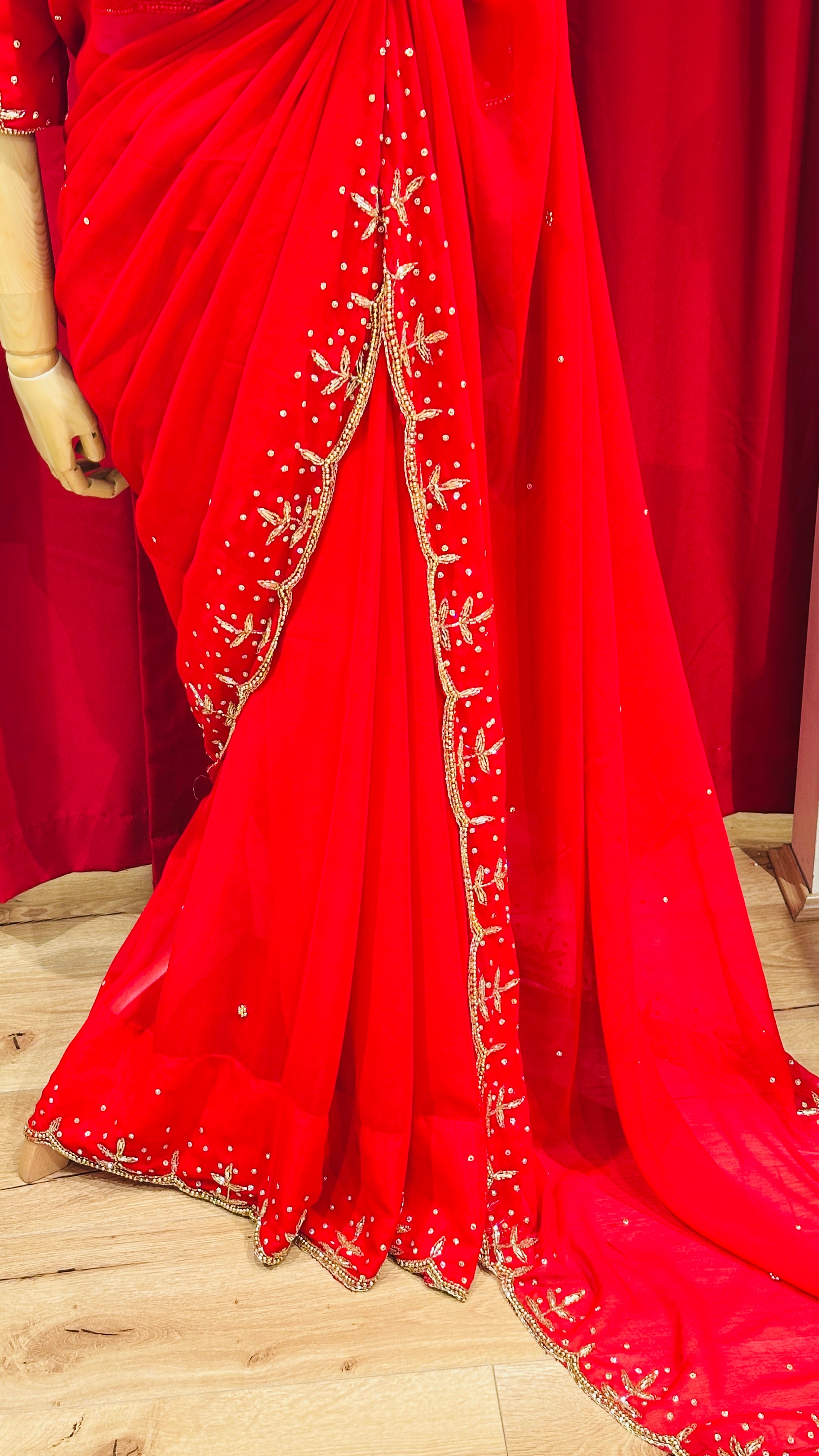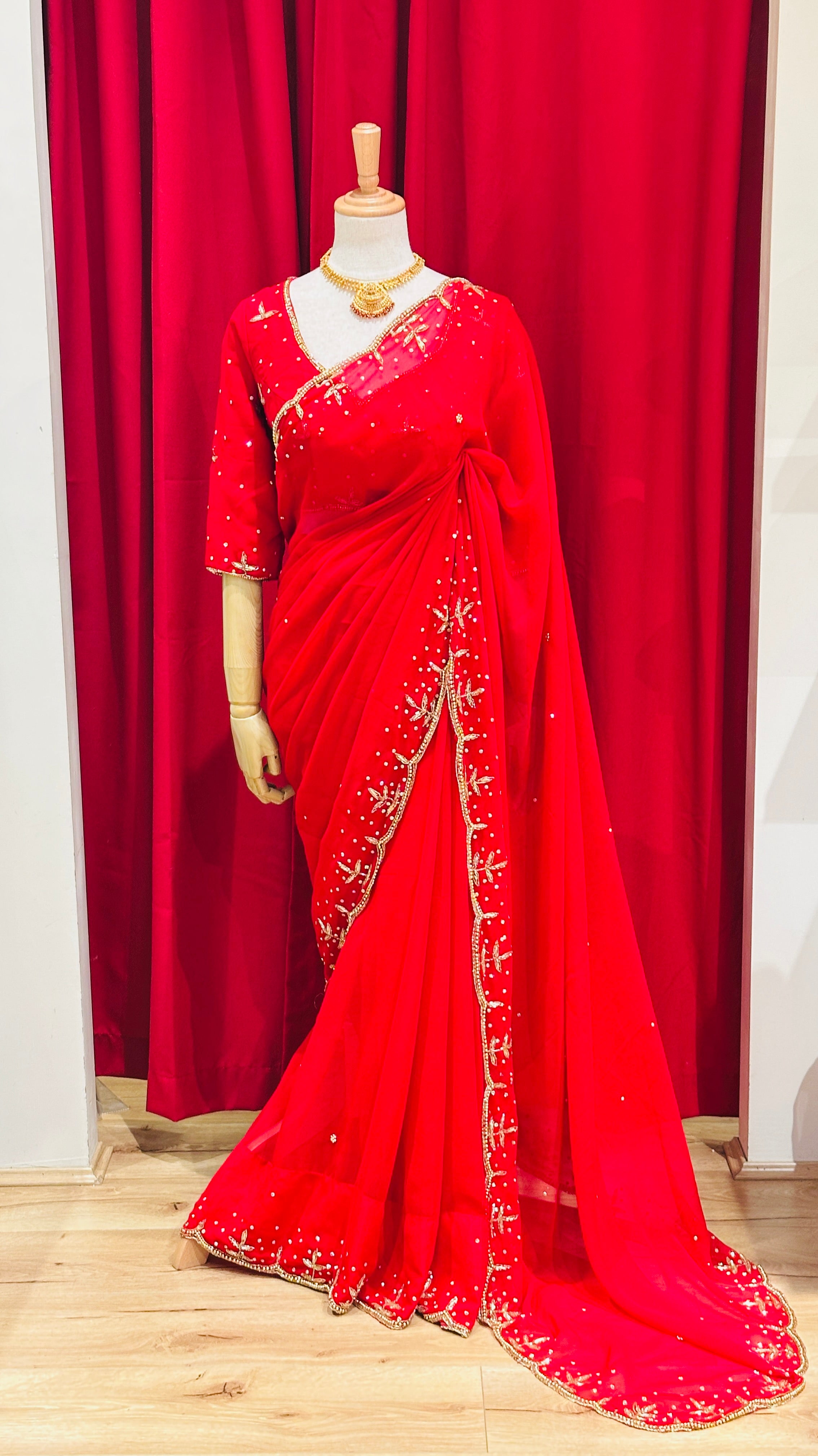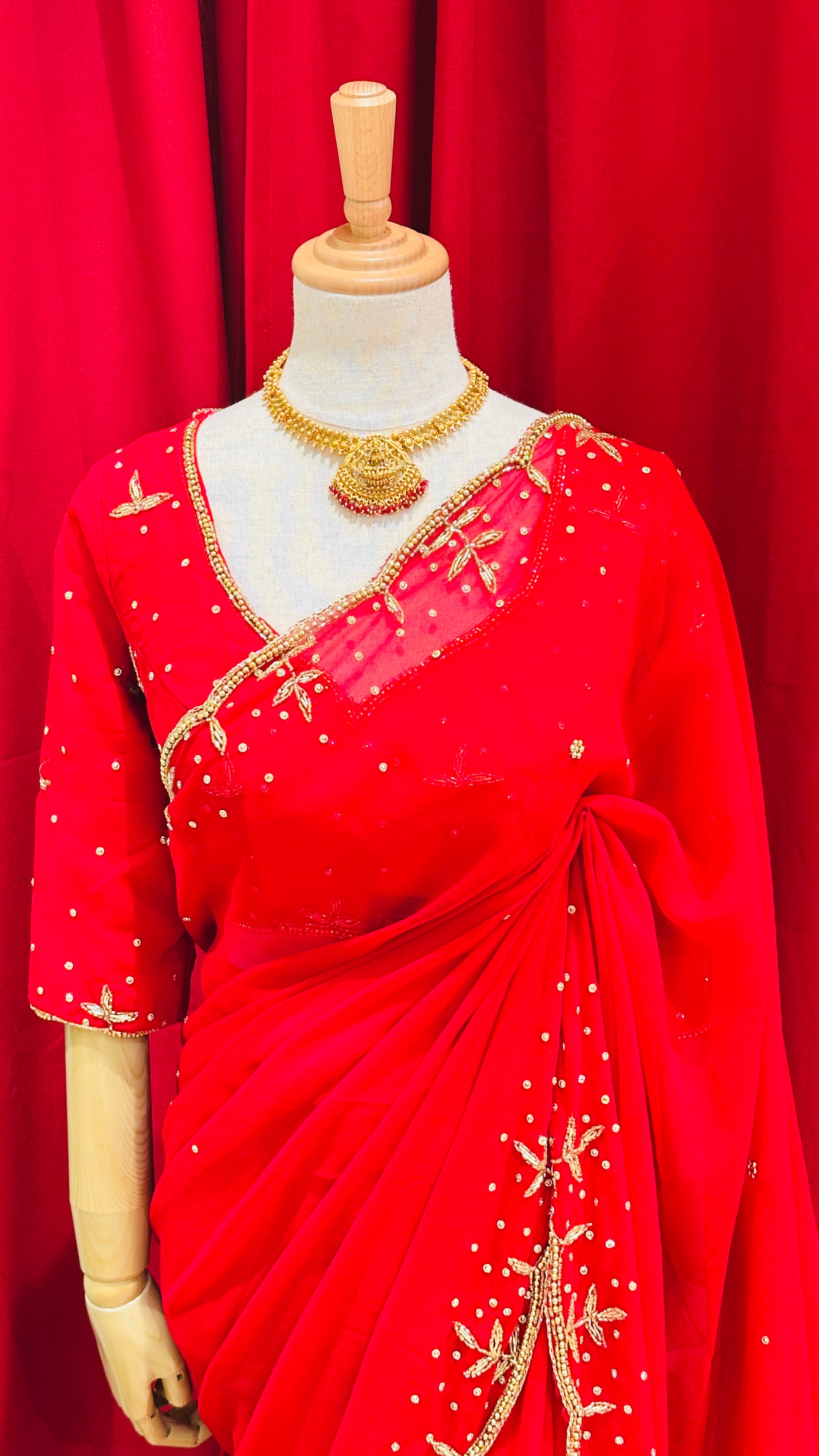 The Bridal Red Saree Set is a timeless expression of elegance, tradition, and grace. Revered as the color of love, strength, and new beginnings, red holds a special place in bridal attire across many cultures. This saree set captures that essence with its rich hue and finely crafted details, designed to make any bride feel radiant and regal on her special day.