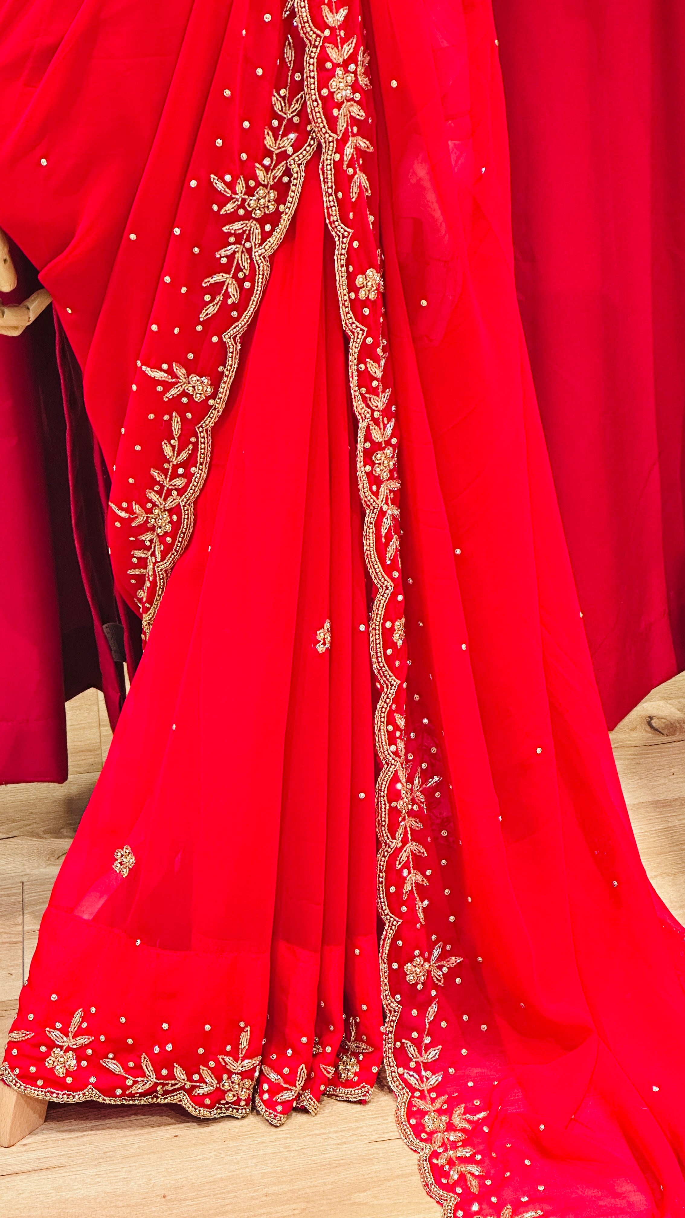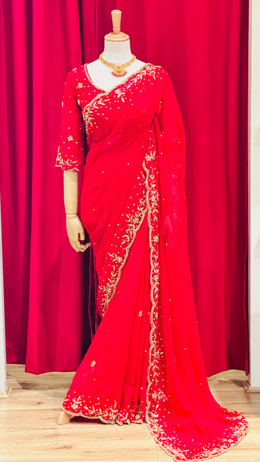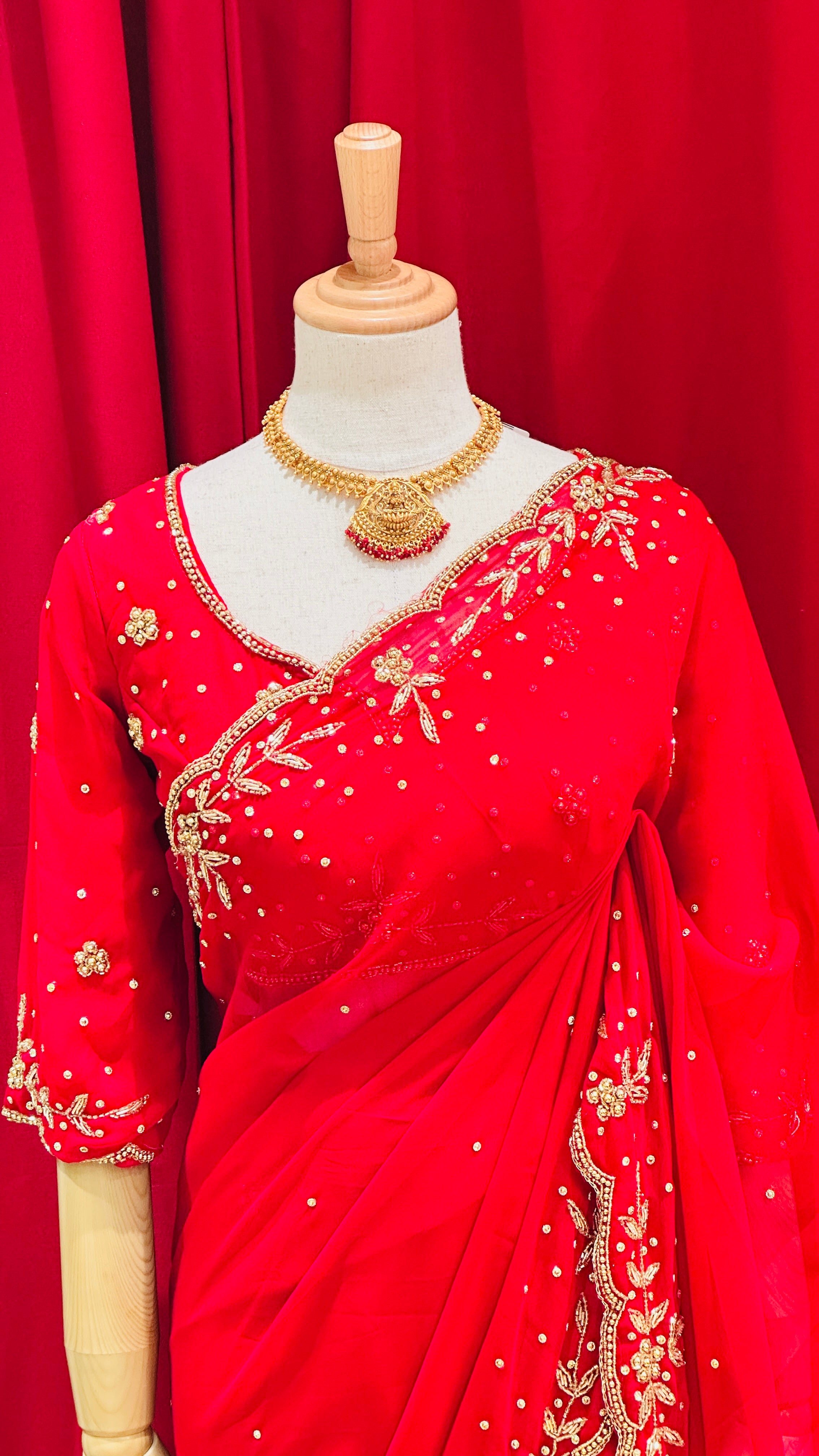 The Bridal Red Saree Set is a timeless expression of elegance, tradition, and grace. Revered as the color of love, strength, and new beginnings, red holds a special place in bridal attire across many cultures. This saree set captures that essence with its rich hue and finely crafted details, designed to make any bride feel radiant and regal on her special day.