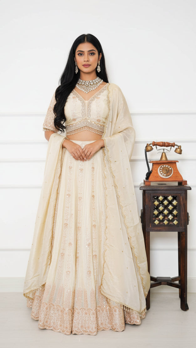 The blouse is designed to complement the lehenga flawlessly, with delicate back tie tassels that add a hint of charm. It includes padded cups for support and comfort, along with extra fabric for easy resizing to achieve a perfect fit. The ensemble is finished with a lightweight dupatta featuring a finely embroidered border, bringing the entire look together with grace. Perfect for weddings, receptions, or festive occasions, this lehenga set blends modern sophistication with timeless beauty.