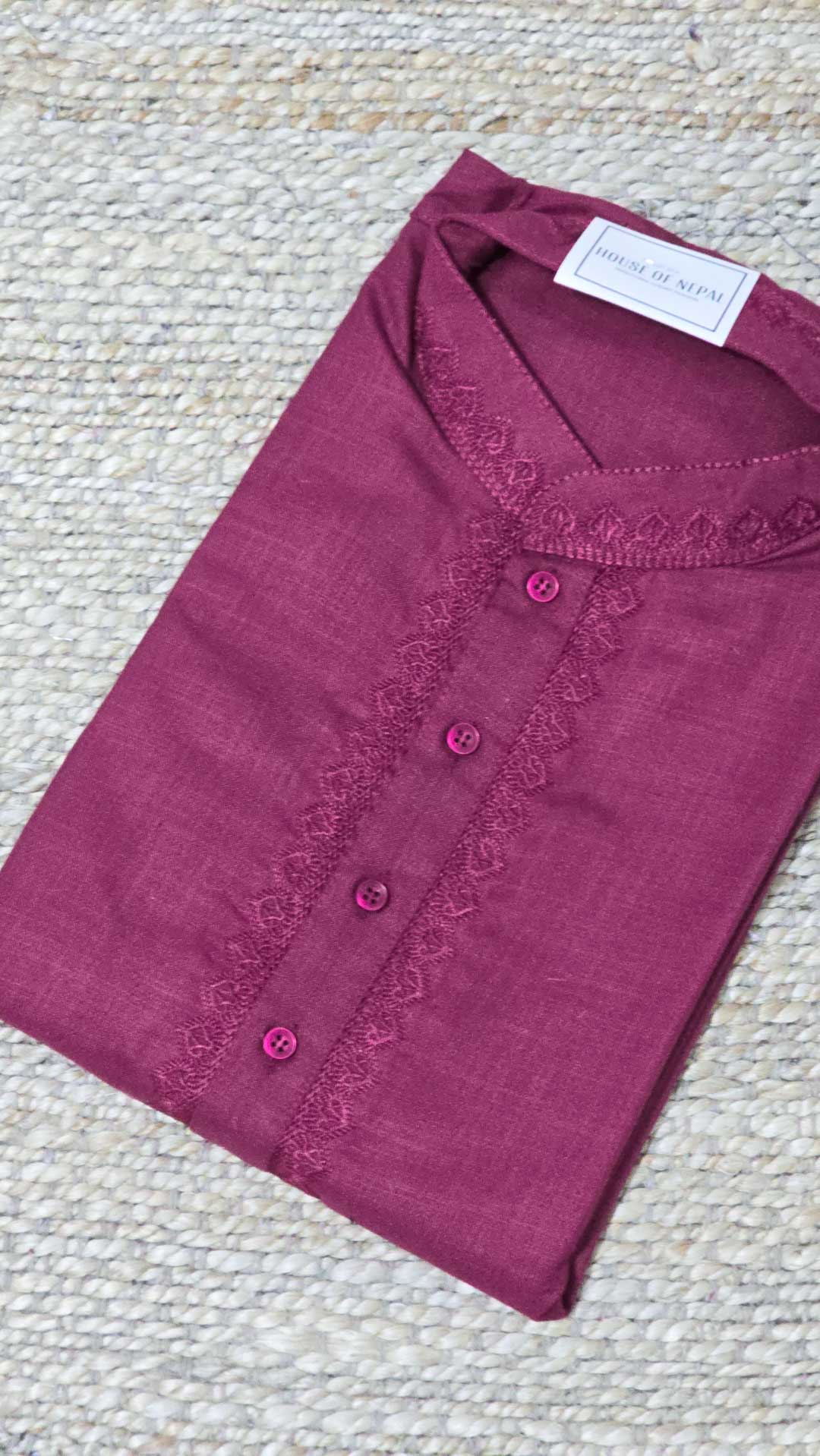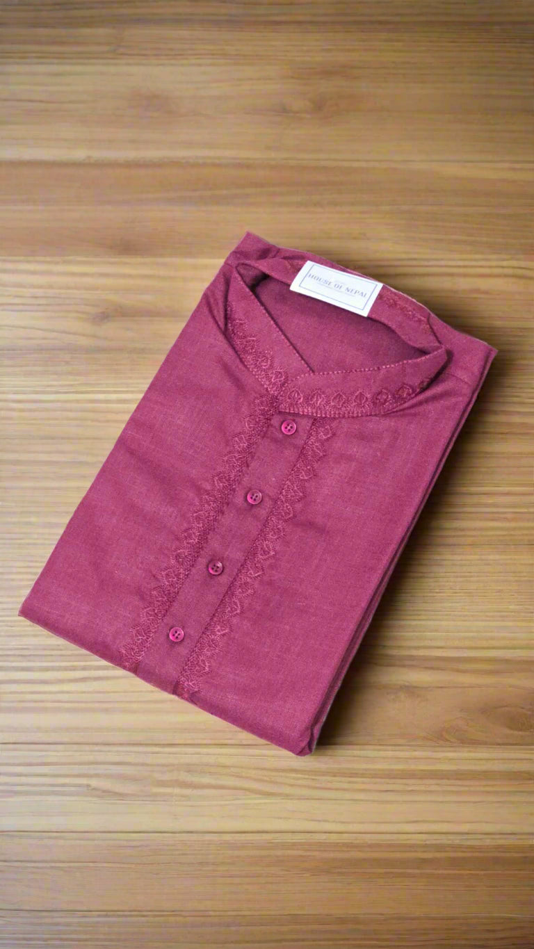 • Mandarin Collar Neck, Buttons and Full Sleeve