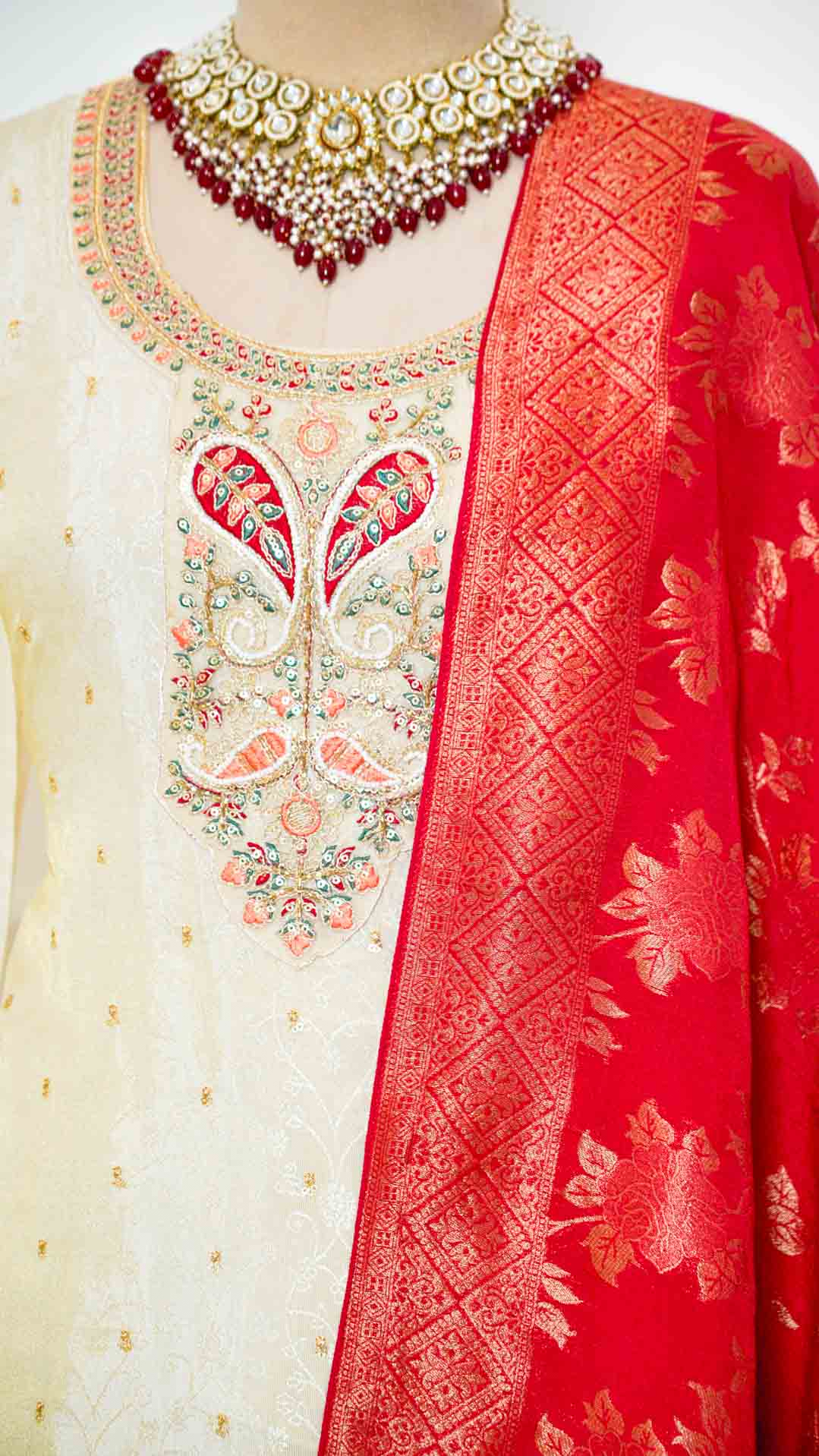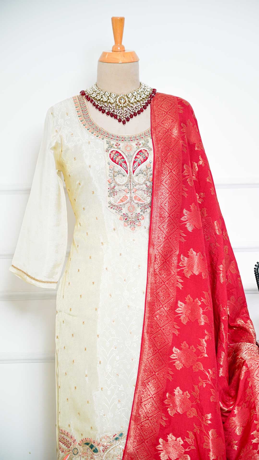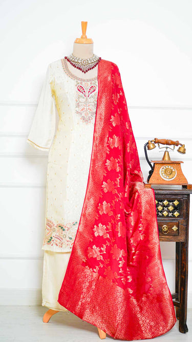 Add a splash of color to your casual wardrobe with this Banarasi Silk Women's Kurta Set in Purple. Made from soft, luxurious silk, it combines traditional craftsmanship with everyday ease. The rich red shade brings a subtle yet striking look, perfect for relaxed outings or casual celebrations.