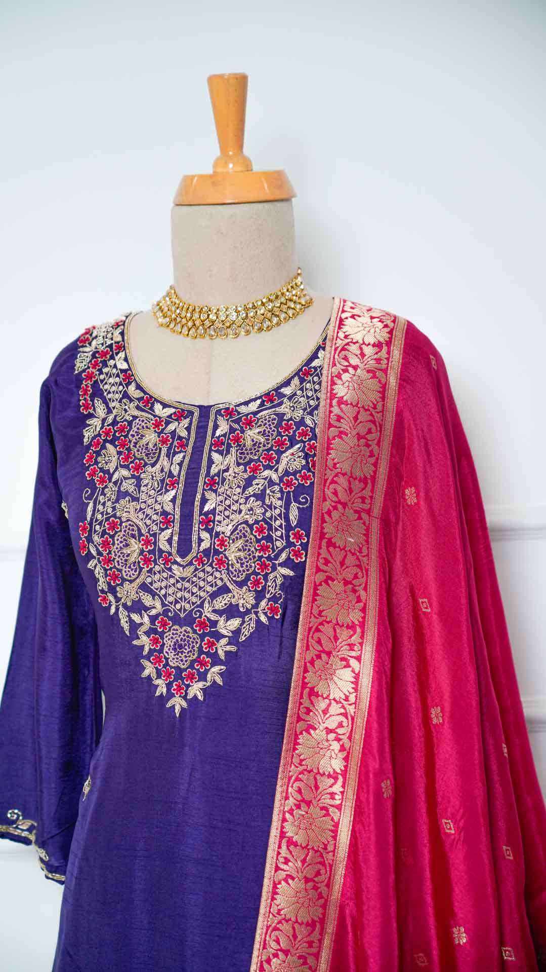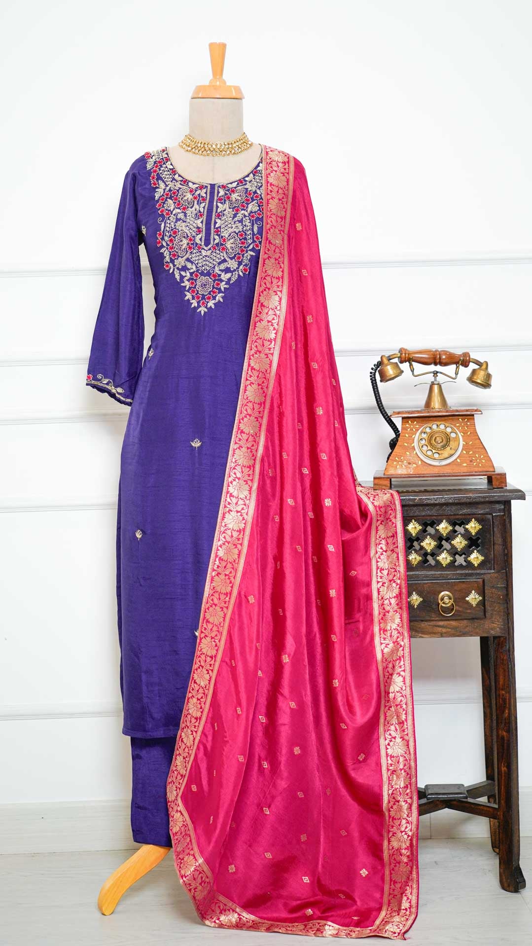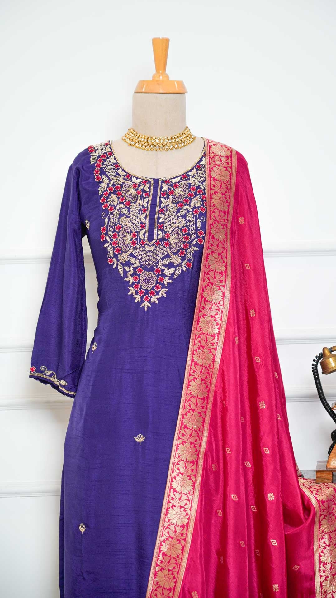 This kurta set features delicate handwork that adds a touch of elegance to your everyday look. Paired with a contrast banarasi shawl and embroidered neckline, it offers both comfort and style, perfect for casual outings or relaxed gatherings. The combination brings a subtle yet sophisticated charm to your wardrobe.