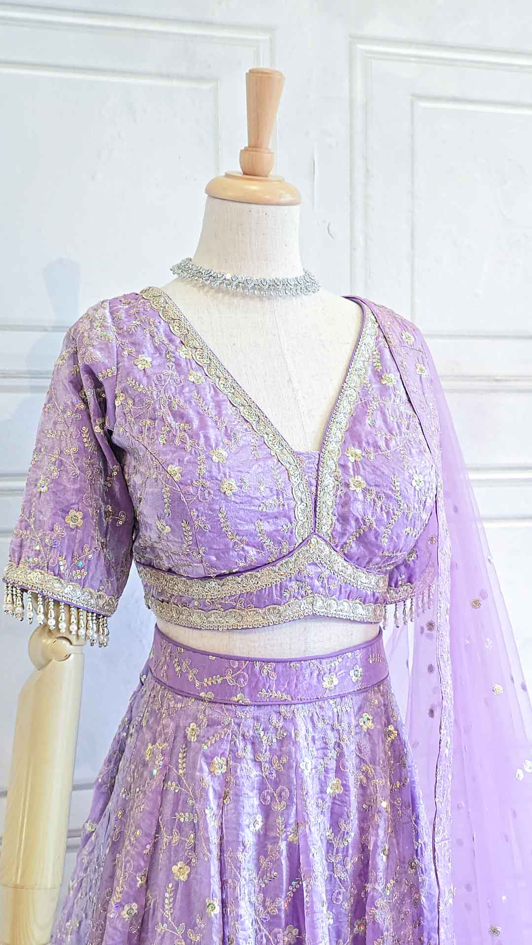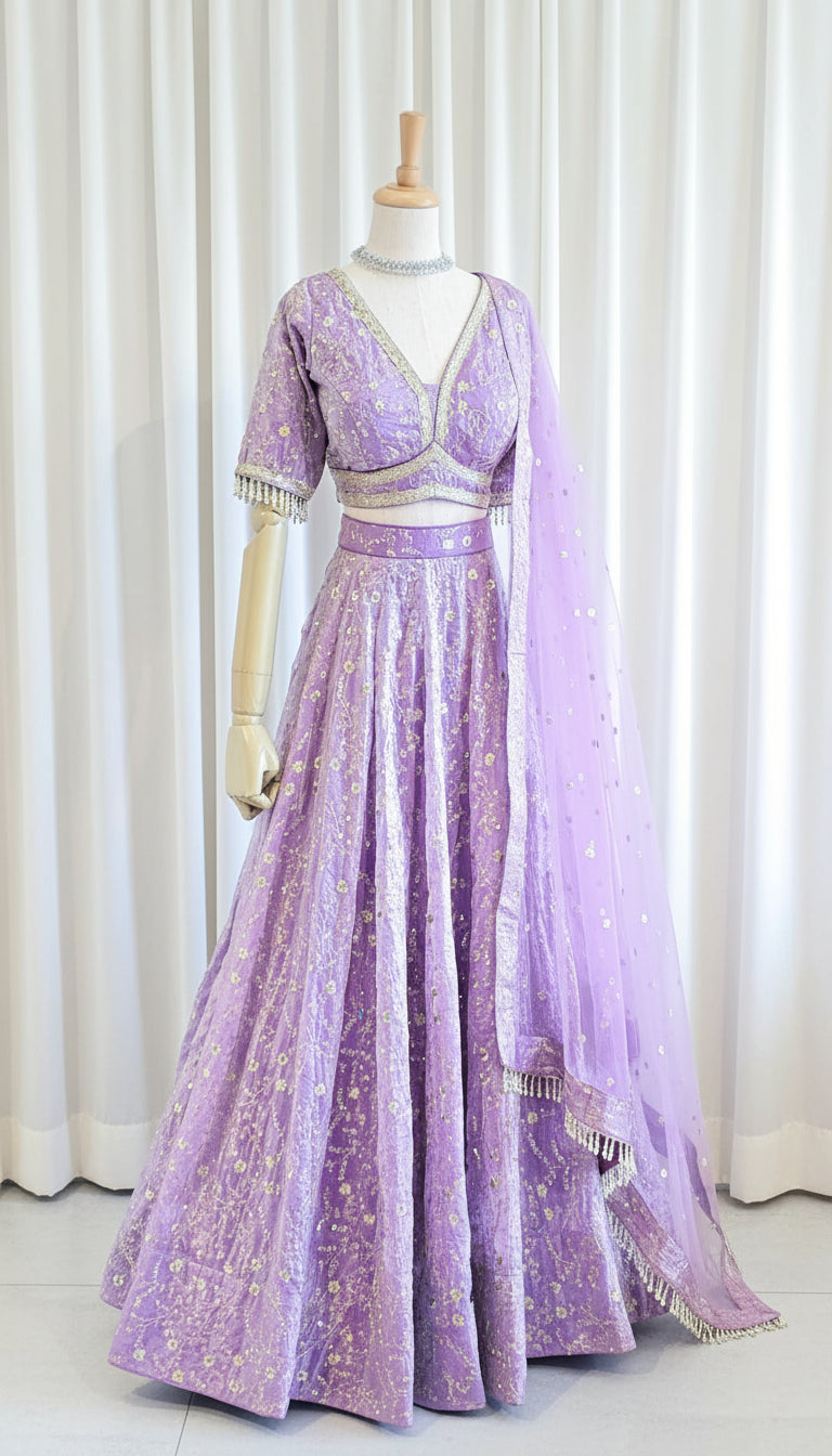 Elevate your style with this enchanting Lavender Fendi Embroidered Lehenga Set, a perfect harmony of luxury and tradition. Crafted in a soft lavender hue, the lehenga skirt features a voluminous silhouette adorned with intricate Fendi-inspired embroidery and subtle sequin detailing that adds a refined shimmer. The drawstring waistband ensures a flexible and comfortable fit, making it ideal for long hours of celebration without compromising on elegance.