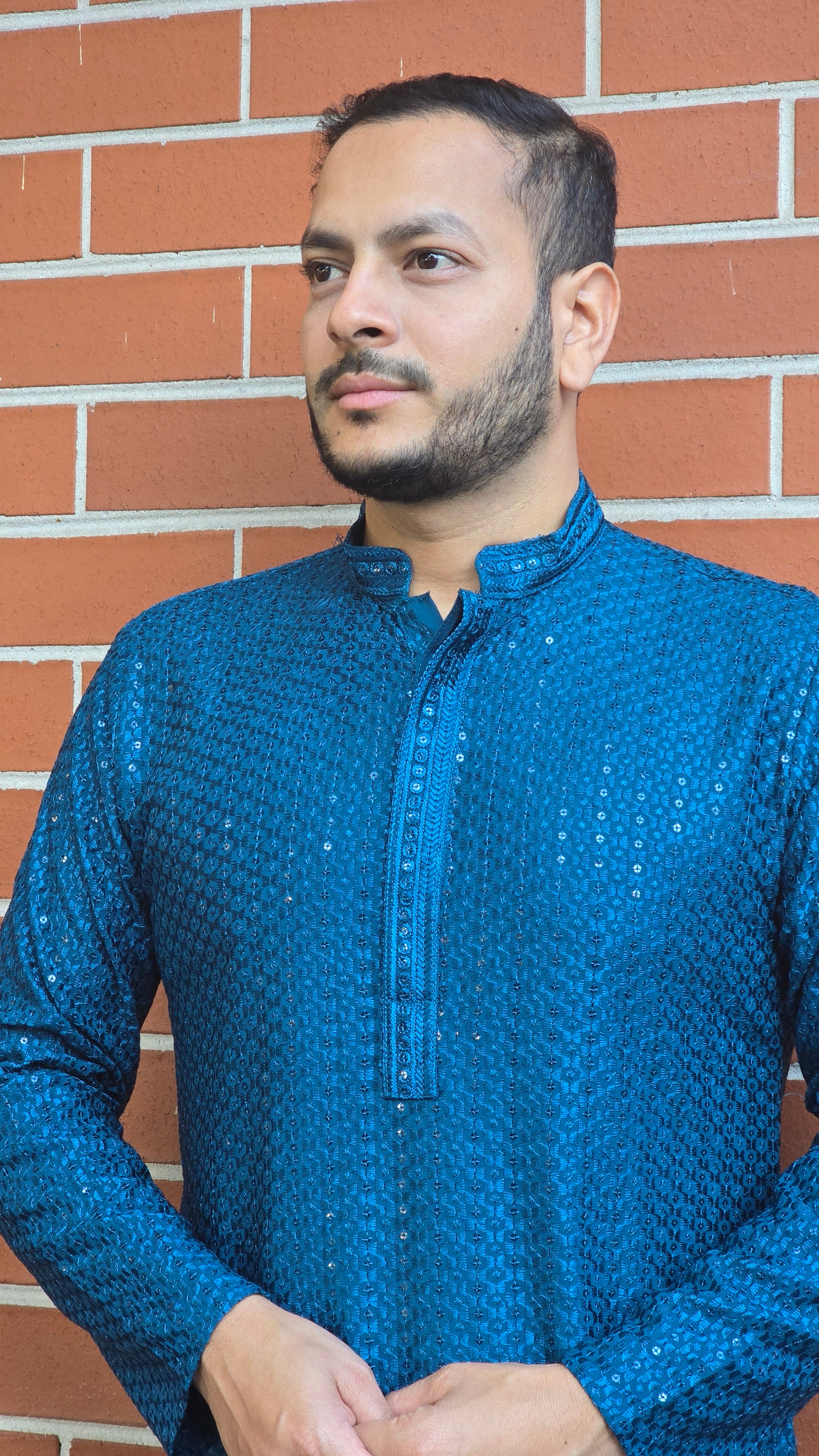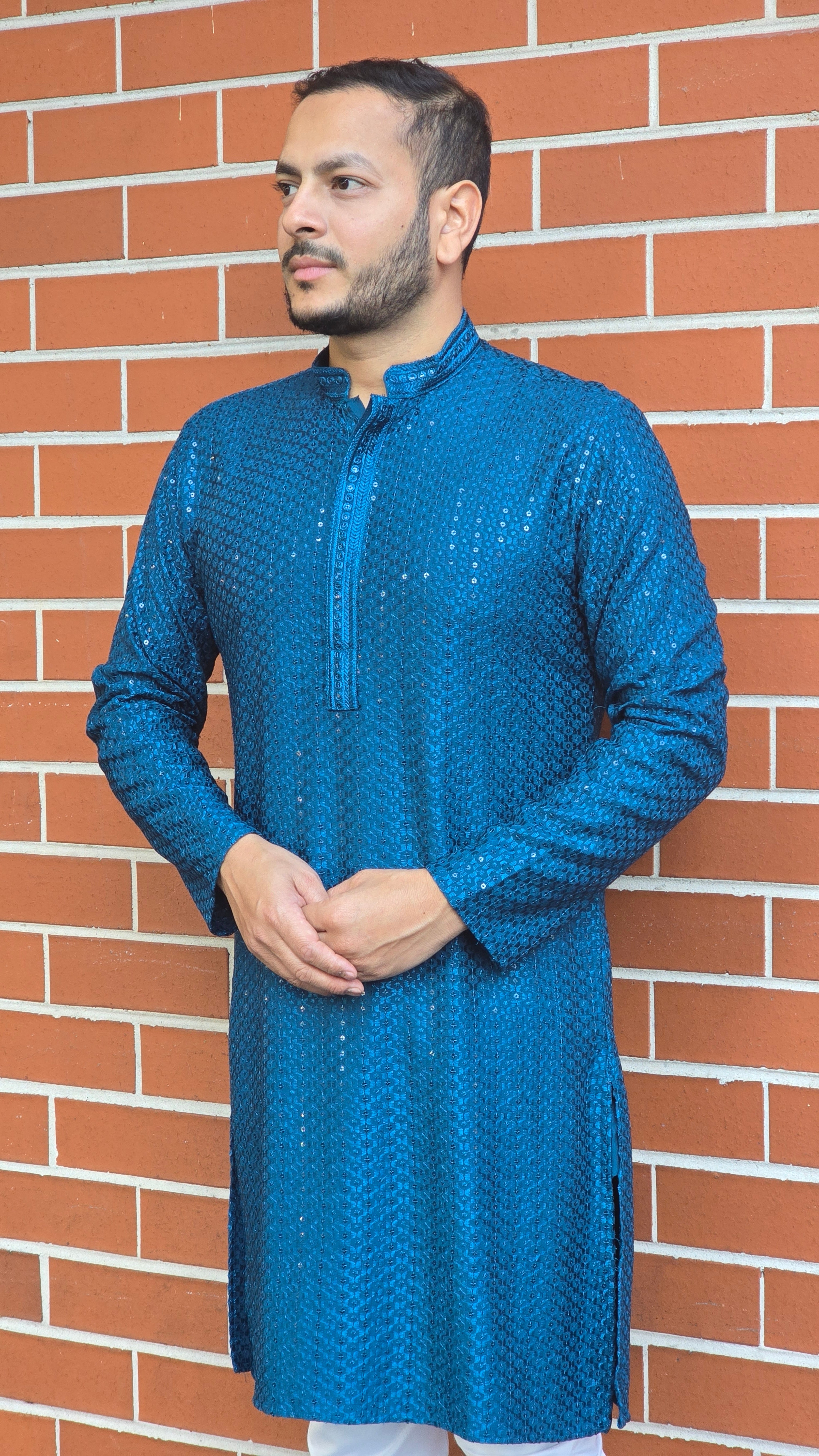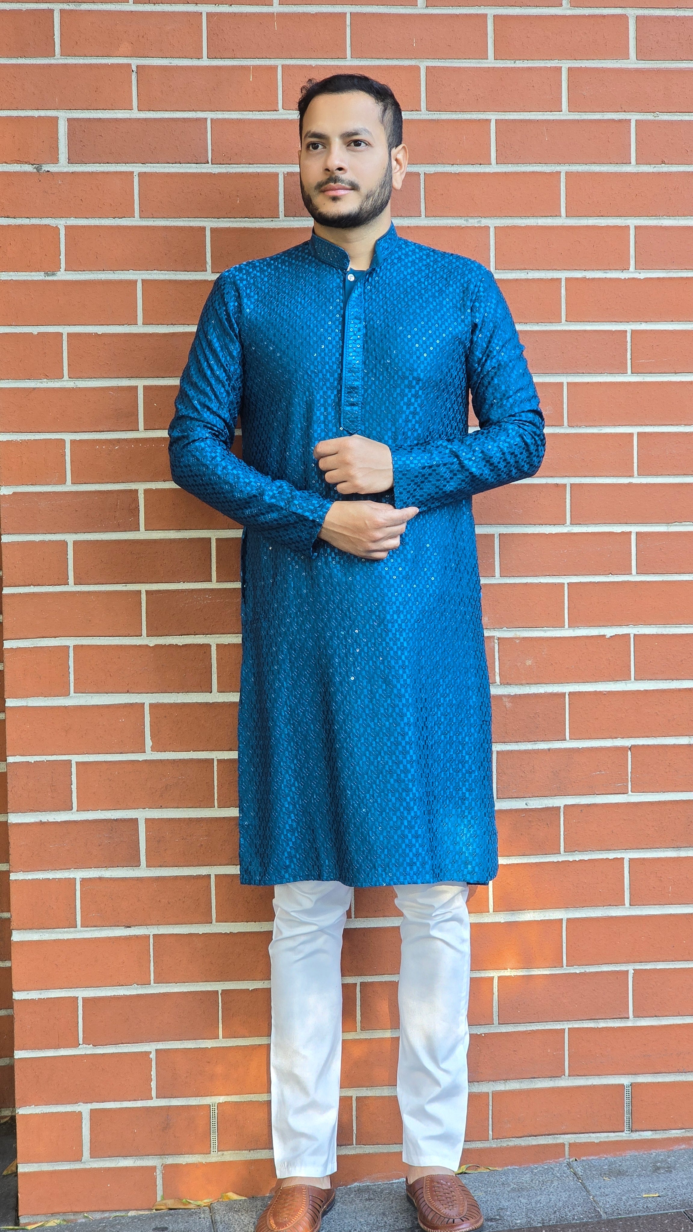 This exquisite Rayon Men's Kurta seamlessly blends traditional craftsmanship with modern design. Crafted from soft, breathable rayon, it ensures both comfort and style. The highlight of this kurta is the intricate Chikankari threadwork, a timeless hand-embroidery technique that adds delicate beauty and texture to the fabric. Enhanced with subtle sequin embroidery, it brings a touch of sparkle and sophistication to the overall design. The kurta features a mandarin collar with a button placket for a sharp, contemporary look, while the side pockets add both practicality and style. Perfect for festive occasions or any special gathering, this kurta offers a refined yet relaxed look with a nod to heritage.