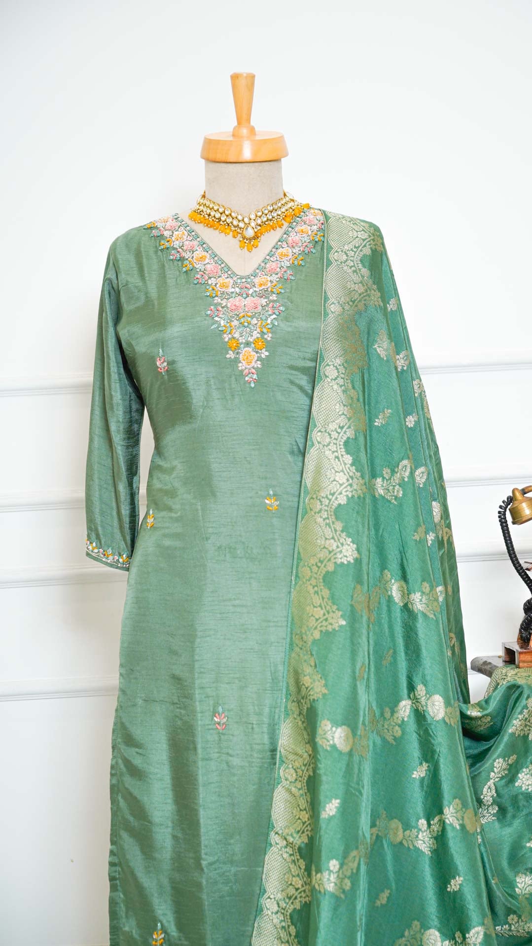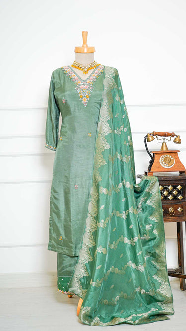 This kurta set features delicate handwork that adds a touch of elegance to your everyday look. Paired with a silk banarasi shawl and handembroidered neckline, it offers both comfort and style, perfect for casual outings or relaxed gatherings. The combination brings a subtle yet sophisticated charm to your wardrobe.