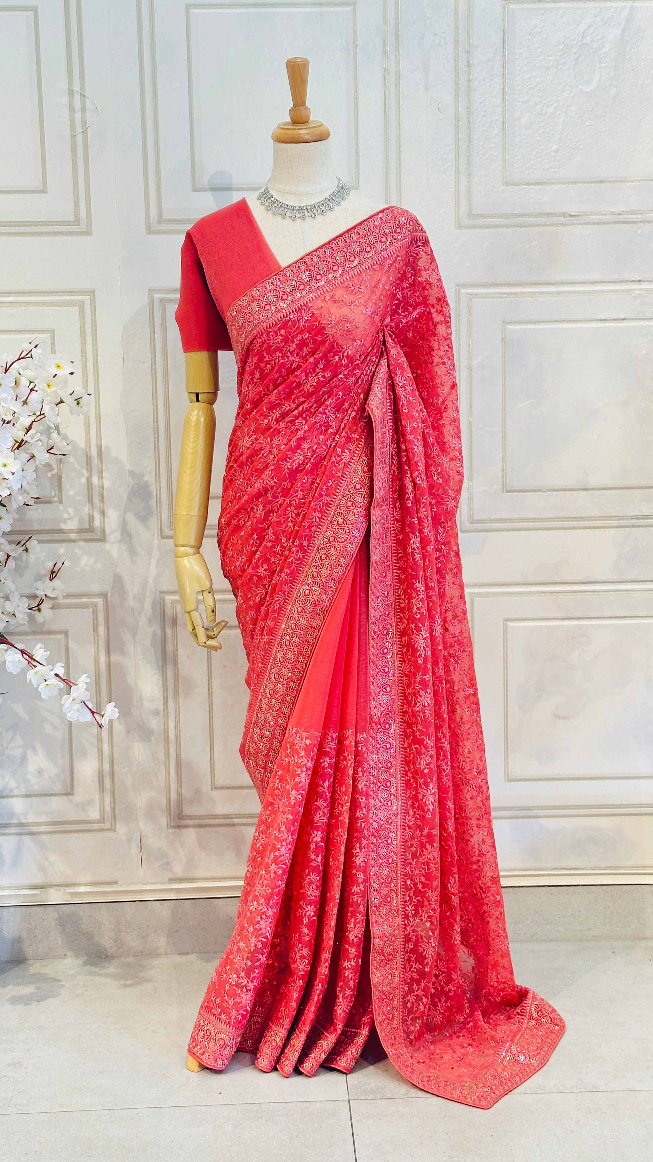 Illuminate any occasion with our Shine Chiffon Saree Saree, where elegance meets sparkle. The saree features a radiant sequin embellishment that catches the light with every movement, creating a dazzling effect. Adorned with intricate resham jaal work, it showcases delicate embroidery in a beautiful, patterned design. The addition of Swarovski accents enhances the saree’s allure, adding a touch of luxury and sophistication.