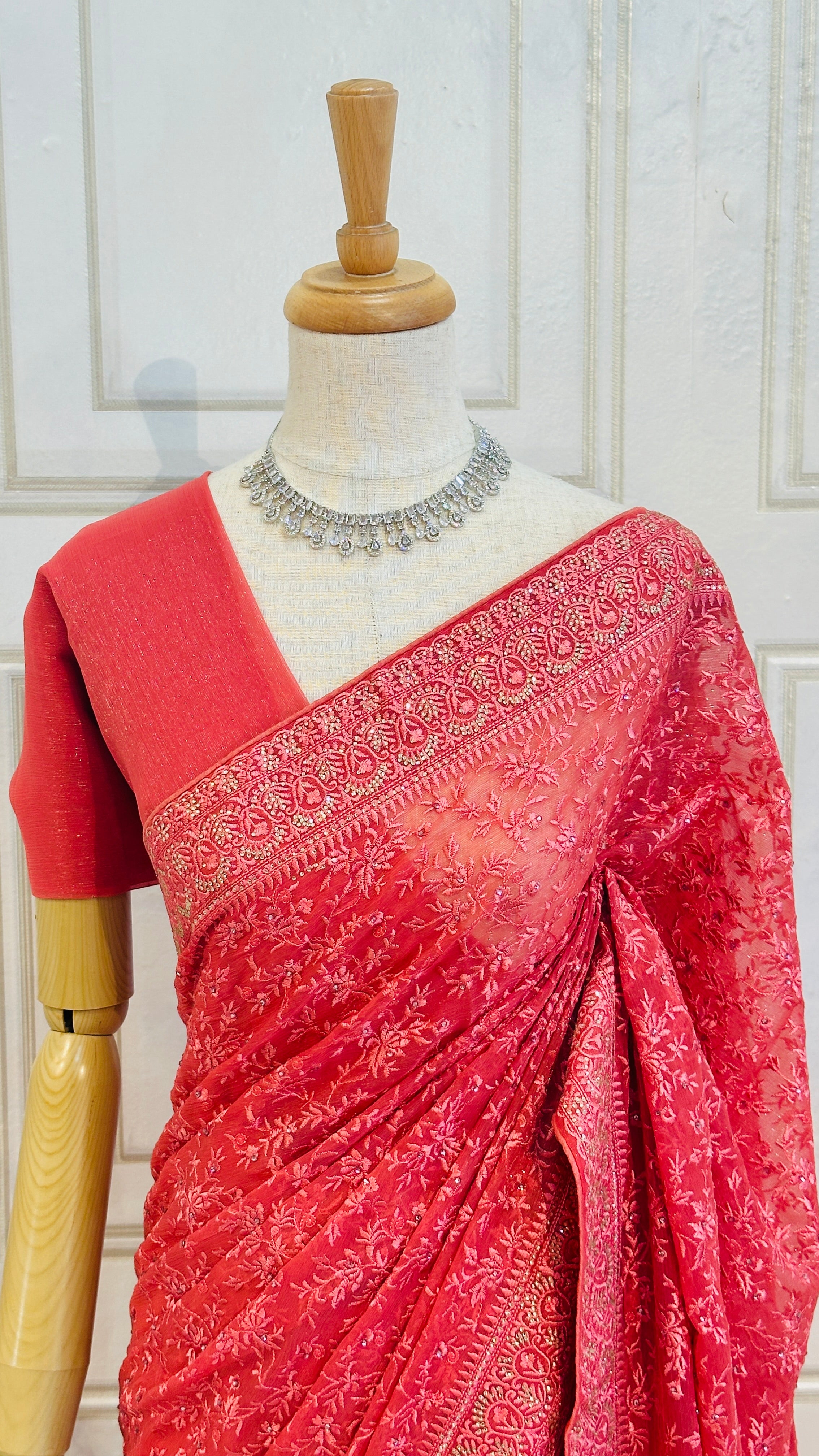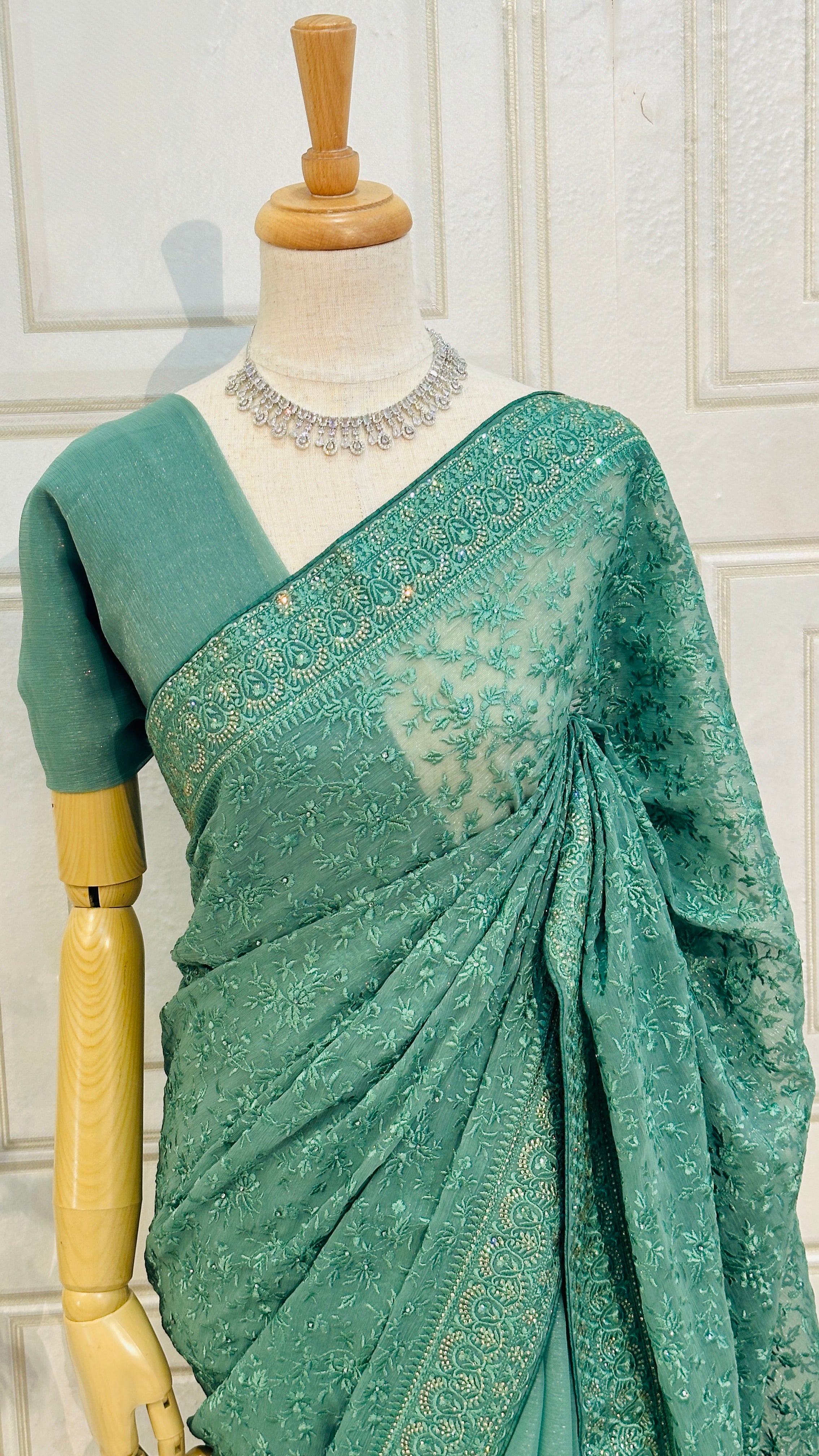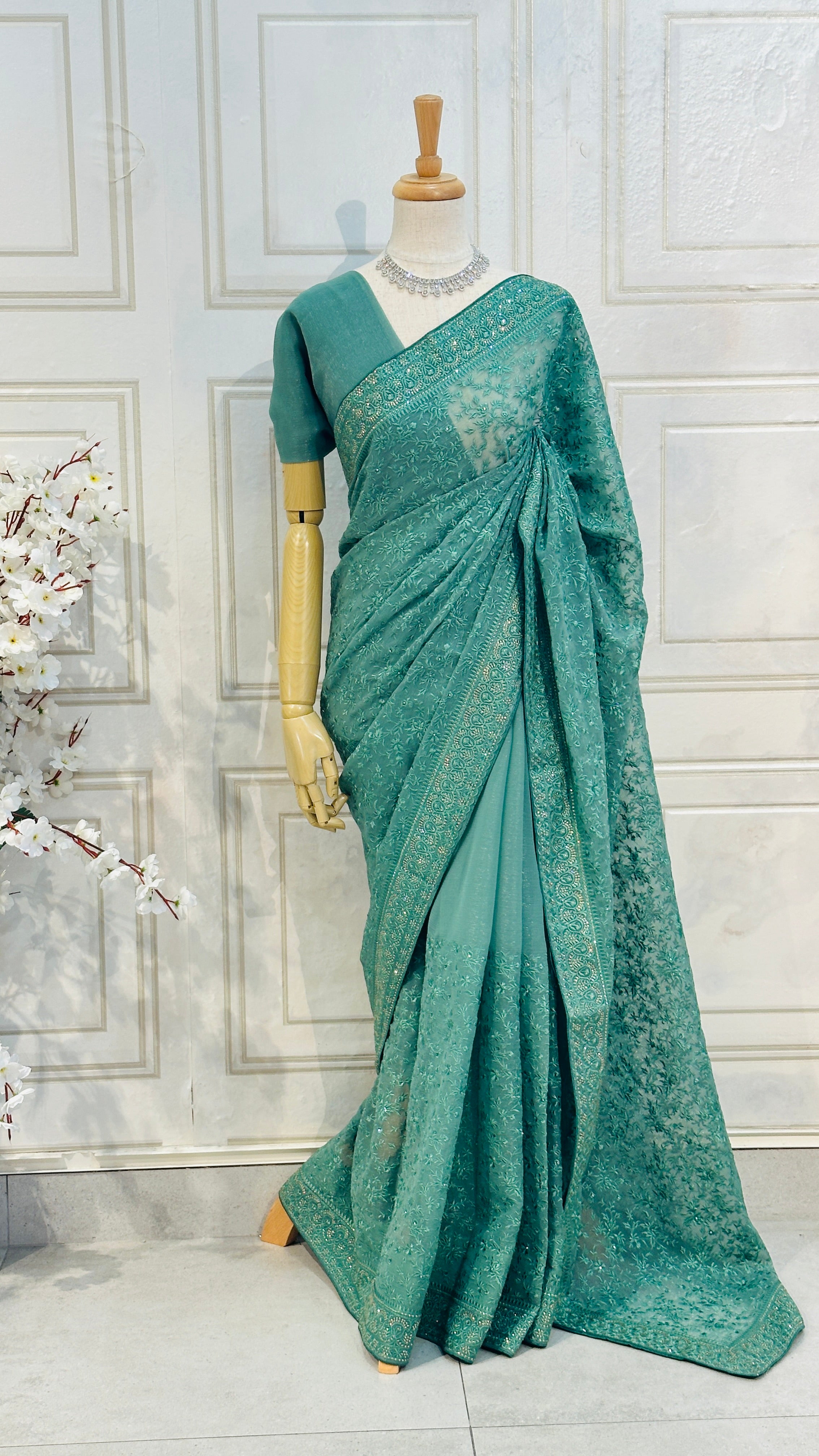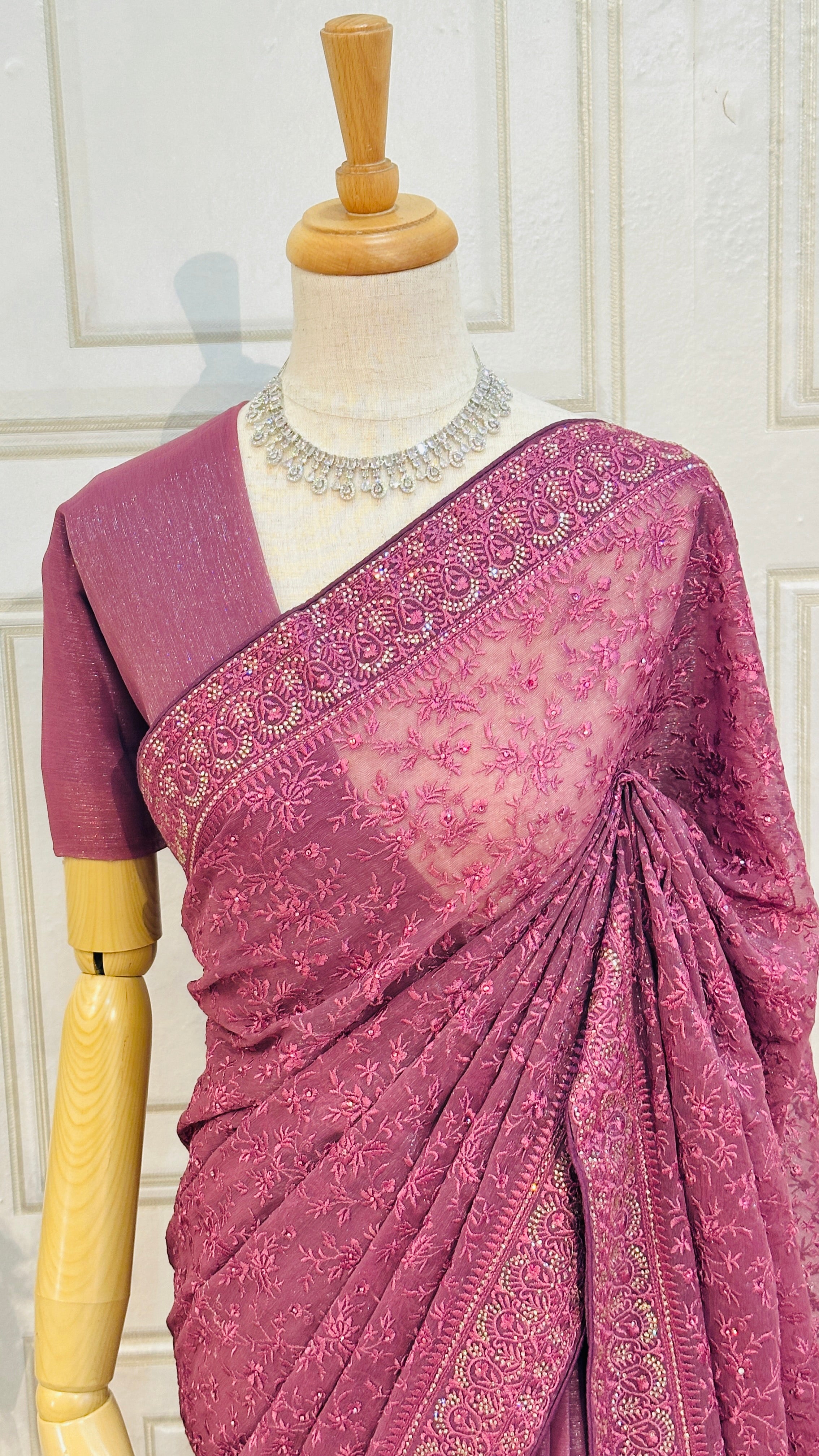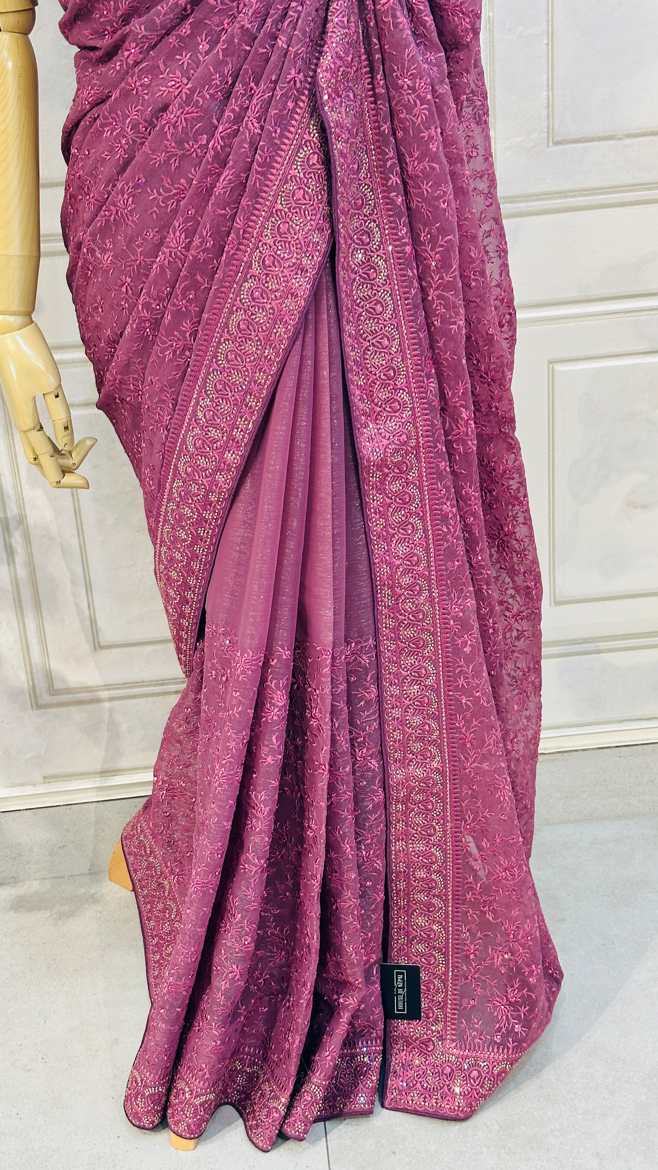 Perfect for festive events and celebrations, this saree combines a shimmering fabric with exquisite craftsmanship for a truly unforgettable look.