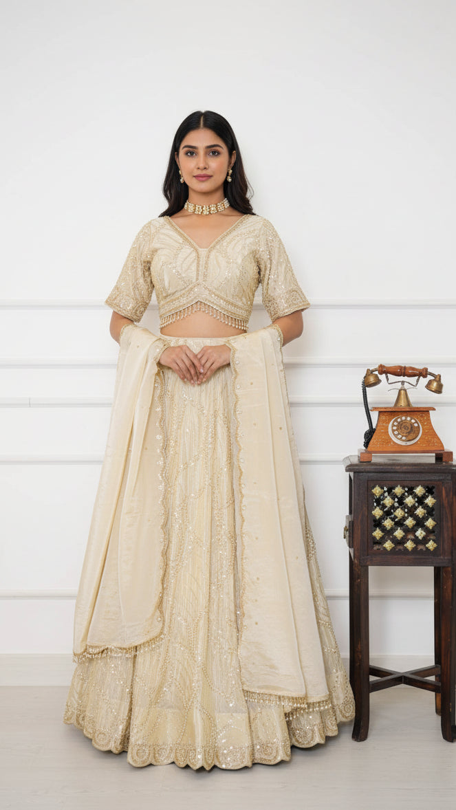 The blouse is designed to complement the lehenga flawlessly, with delicate back tie tassels that add a hint of charm. It includes padded cups for support and comfort, along with extra fabric for easy resizing to achieve a perfect fit. The ensemble is finished with a lightweight dupatta featuring a finely embroidered border, bringing the entire look together with grace. Perfect for weddings, receptions, or festive occasions, this lehenga set blends modern sophistication with timeless beauty.