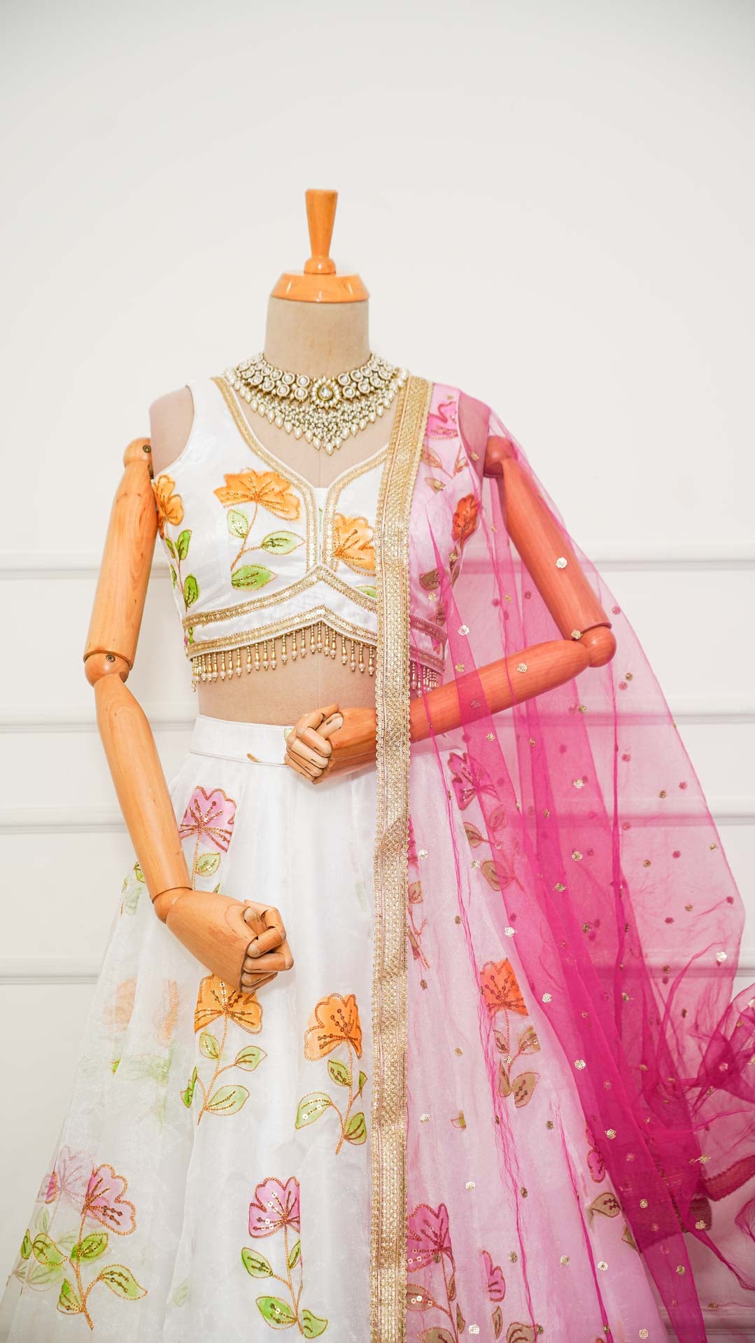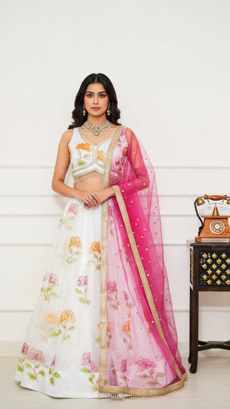 White Floral Organza Lehenga with Contrast Dupatta