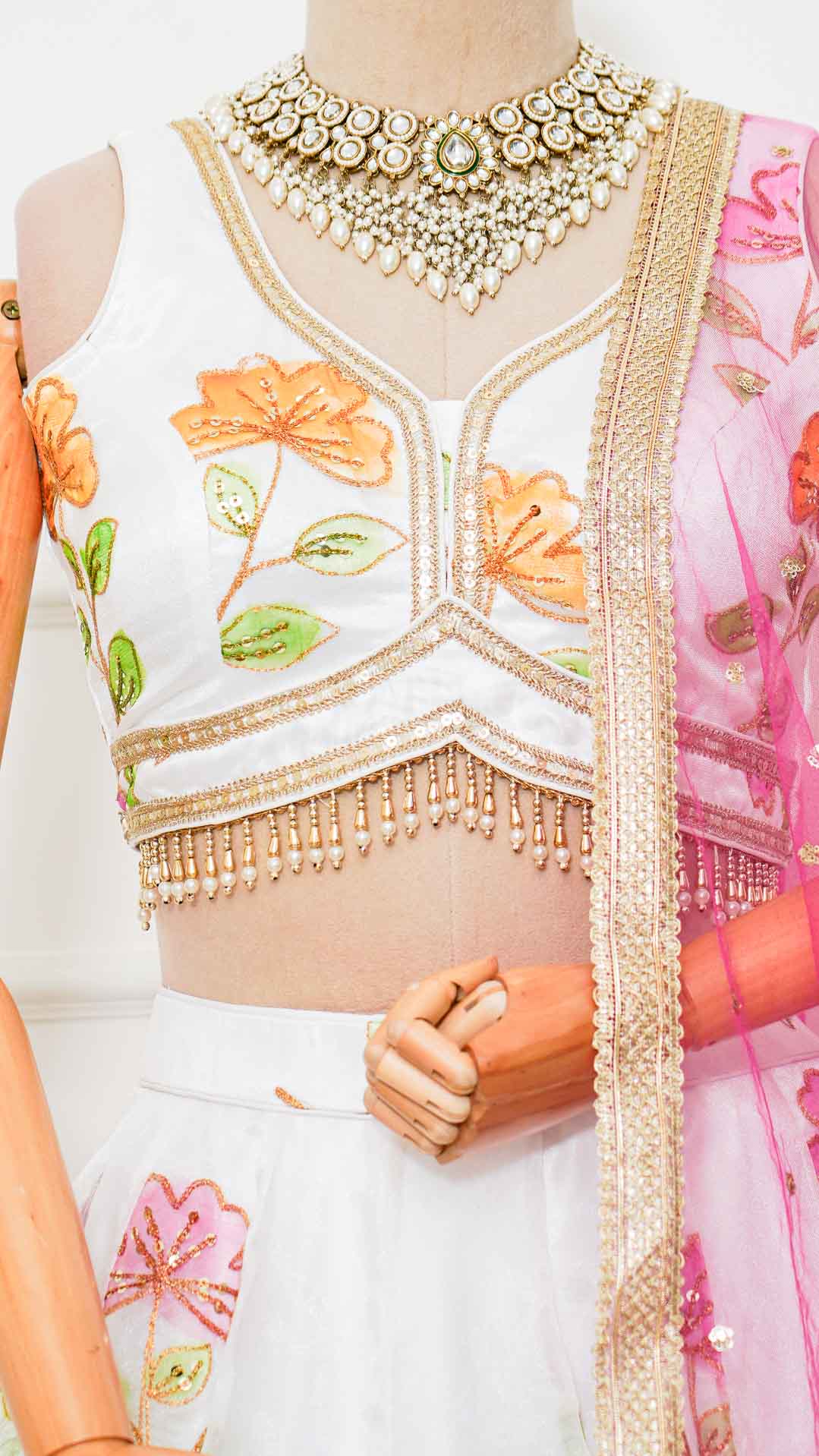 Brighten your summer with this playful white organza lehenga, featuring hand-painted florals and shimmering zari embroidery. The lightweight, breathable fabric keeps you cool while the vibrant floral design brings energy to any occasion. The coordinating contrast dupatta adds dimension and style. Complete three-piece set includes the lehenga skirt, matching blouse, and dupatta—everything you need for an effortless, elegant look.