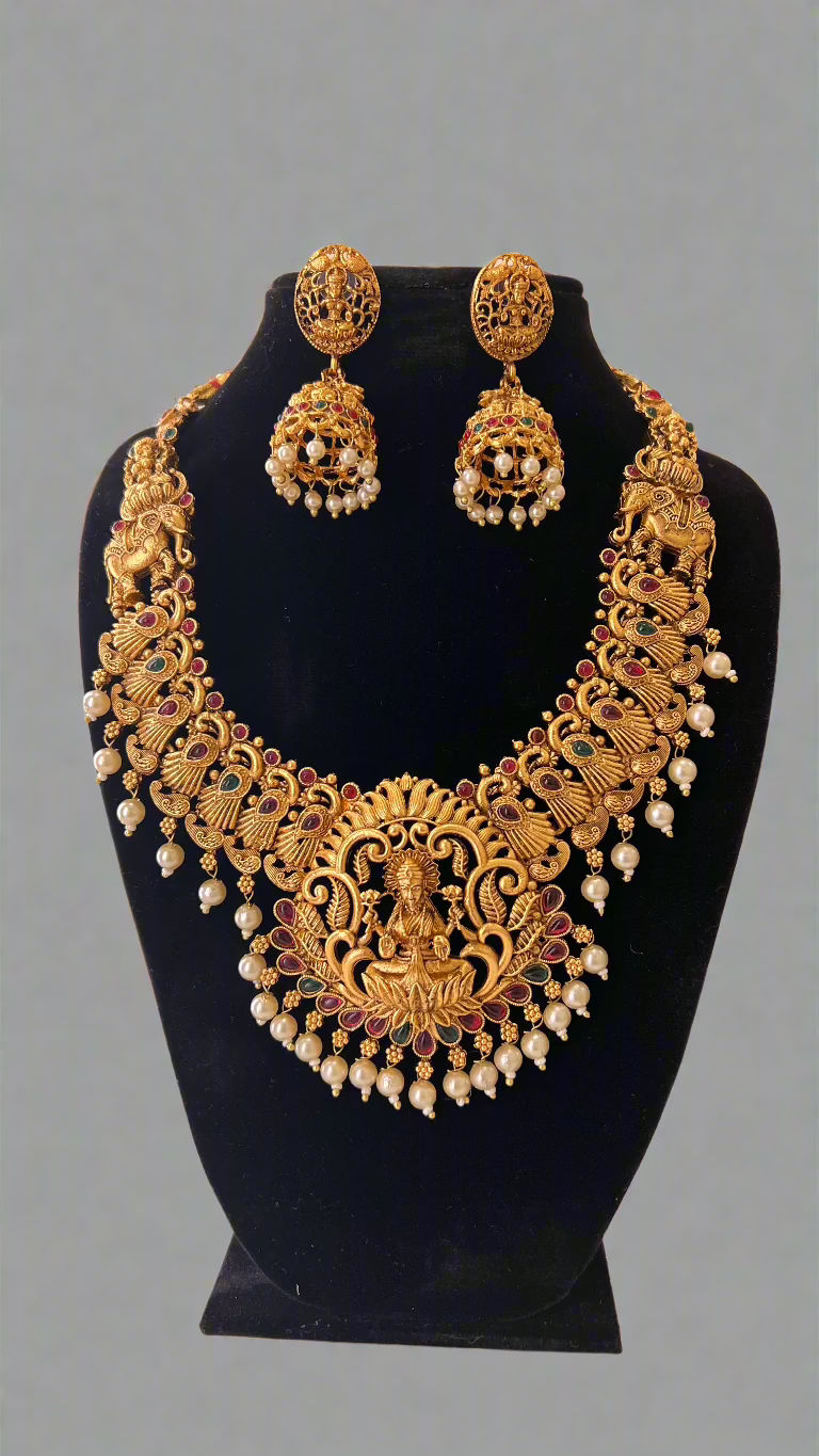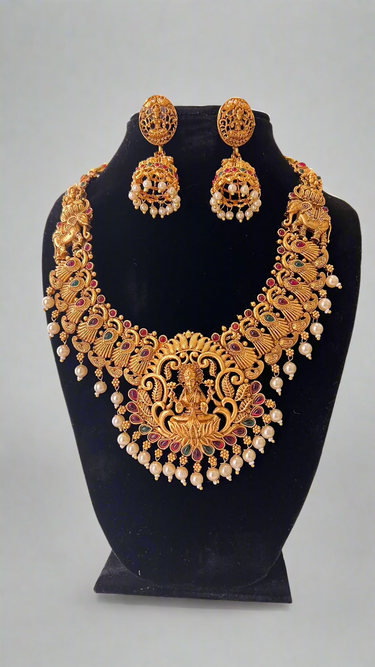 White Pearl Temple Jewellery Haar with Earrings Lakshmi